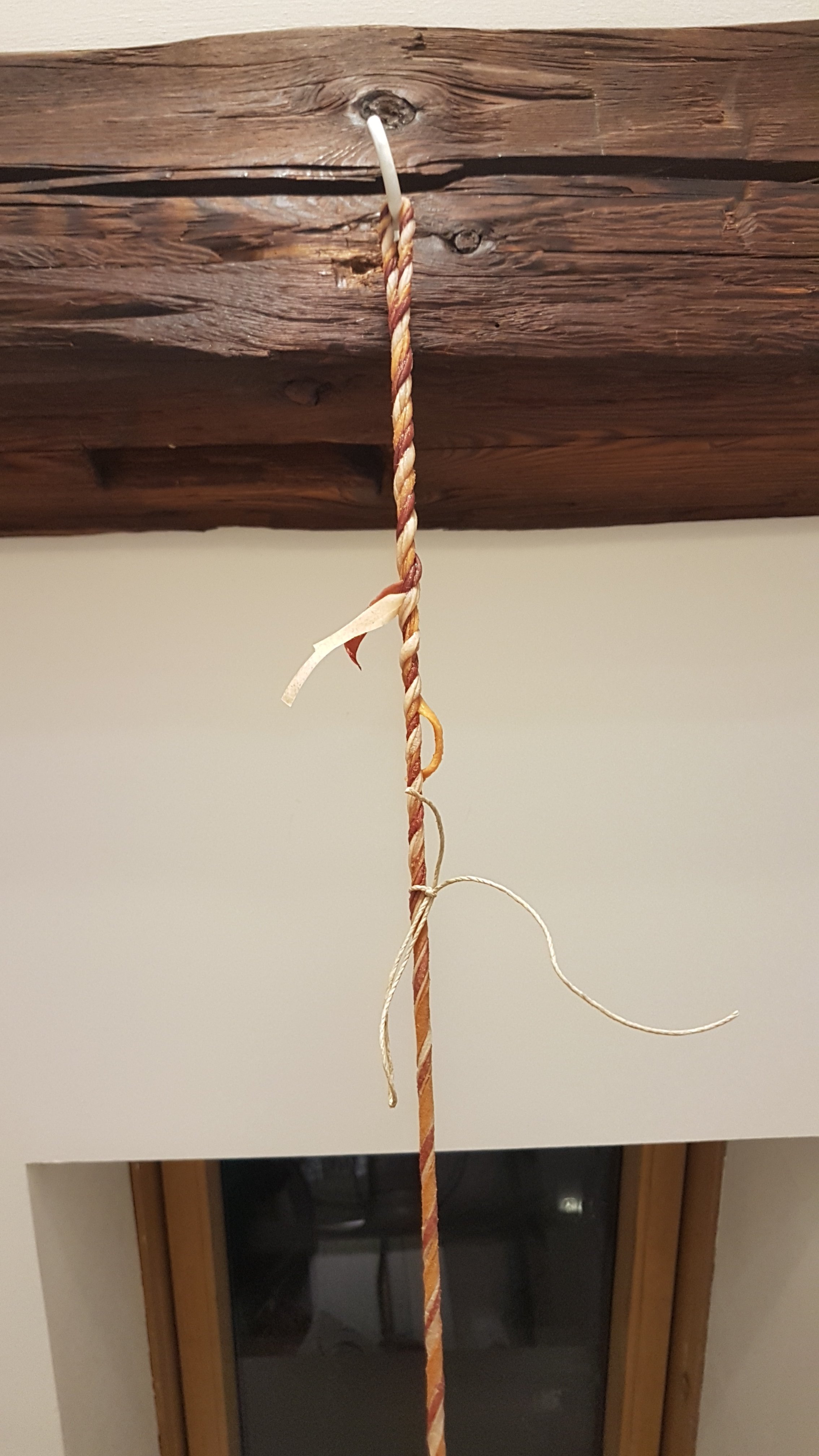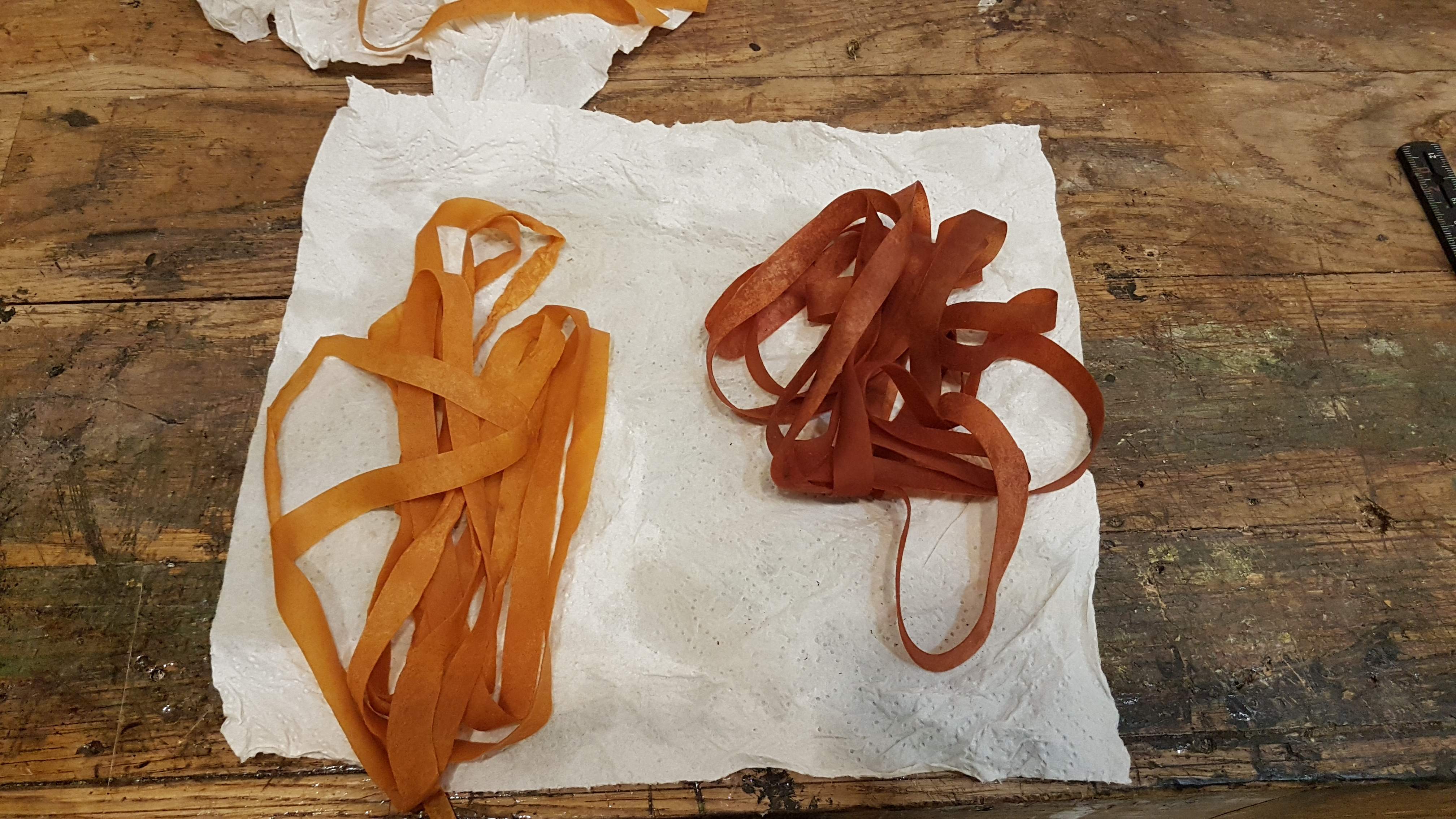 Ich werde eine 3-Strang-Sehne spleißen, dazu färbe ich einen Strang rot mit Krapp und einen gelb-Orange mit Osage. Das hilft beim Spleißen mit 3 Strängen nicht durcheinander zu kommen.