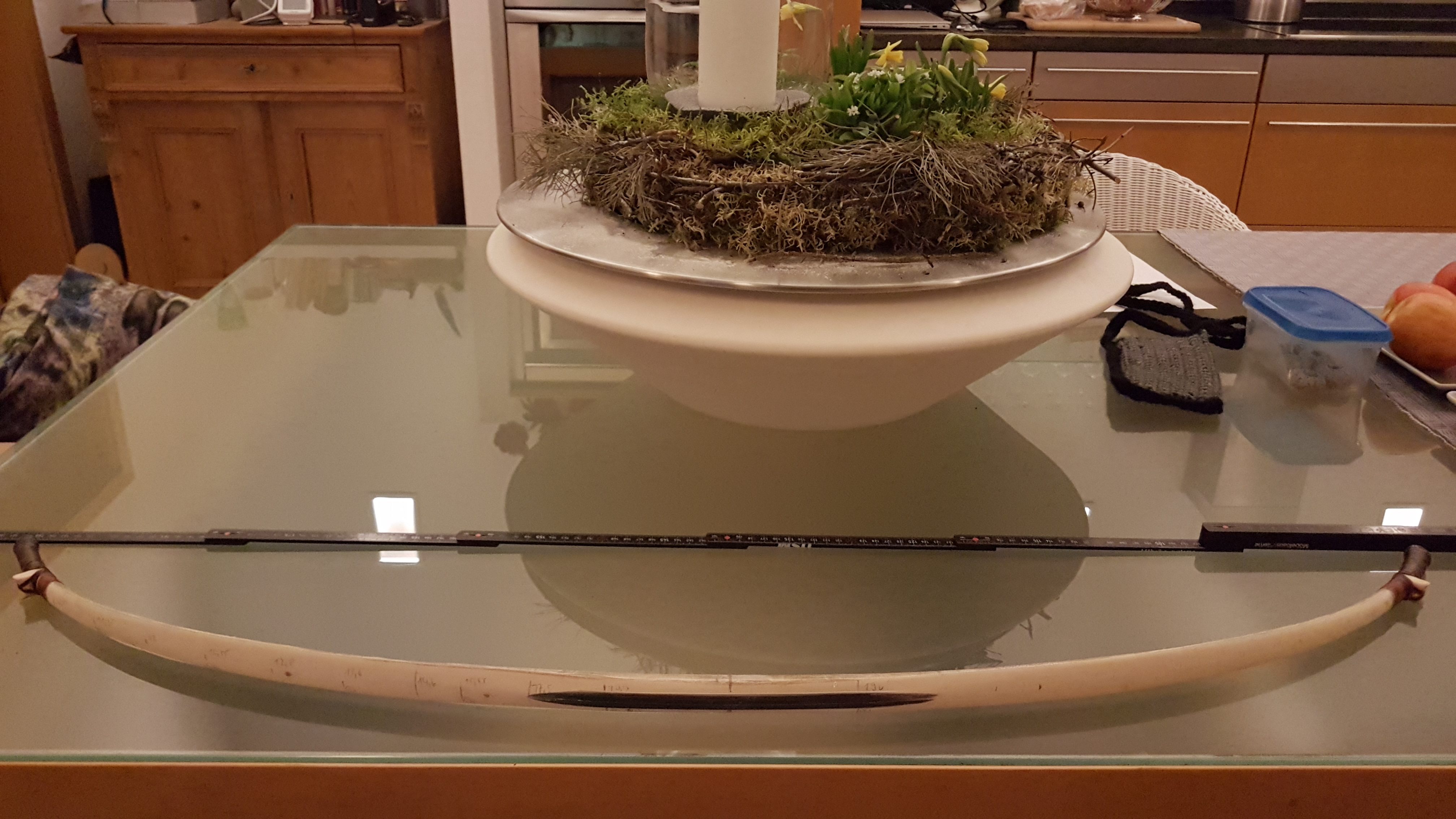 Ich bin gespannt wieviel ich noch dehnen muss (und ärgere mich schon wieder, dass ich die Länge ohne Dehnung nicht gemessen habe) und wieviel Zuggewicht das Ding aushält. Das Zuggewicht kann ich jetzt auch besser einschätzen. Ich hatte bis 22" gezogen und hatte knapp 40#. Es ist ein sog. Eiertanz, da es bei minimaler, einseitiger Material-Abnahme schon seitlichen Verzug gibt, die Sehnenlage eiert hin und her