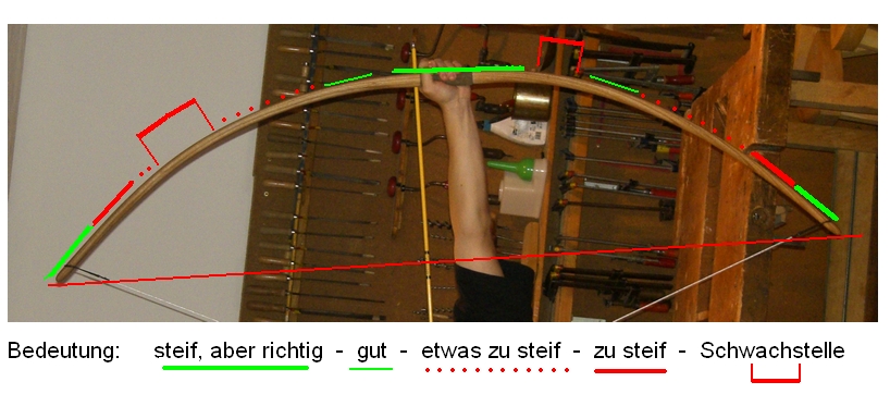 Mutig, sich im Erstversuch an so ein welliges Stück zu machen, und wenn der rechte WA der untere ist, ist der Tiller sogar schon ganz ordentlich, und das beim Erstling... Respekt! Dicht an den Griffen, gleich hinter der Übergangszone, biegt er etwas zu viel, dafür ist er je in Wurfarm-Mitte etwas steif, aber das passiert den Meisten zu Anfang!