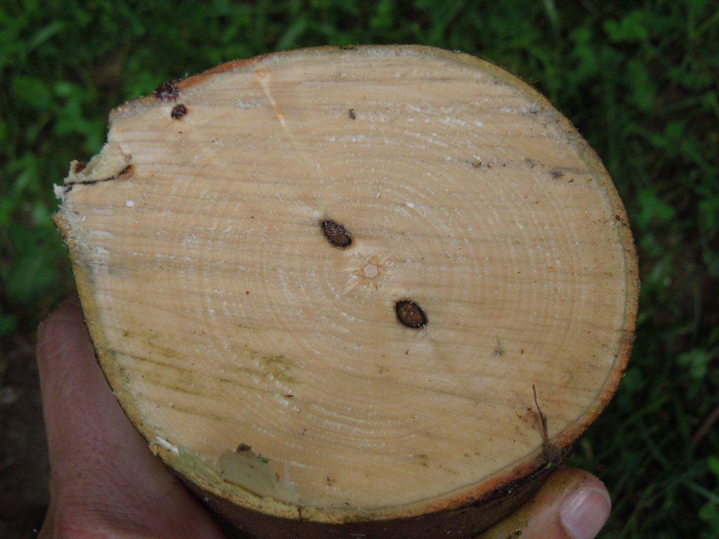 die Ringe sind unregelmäßig und eher dünn, der äussere Bereich sieht nicht so schlecht aus - wenig Frühholz...