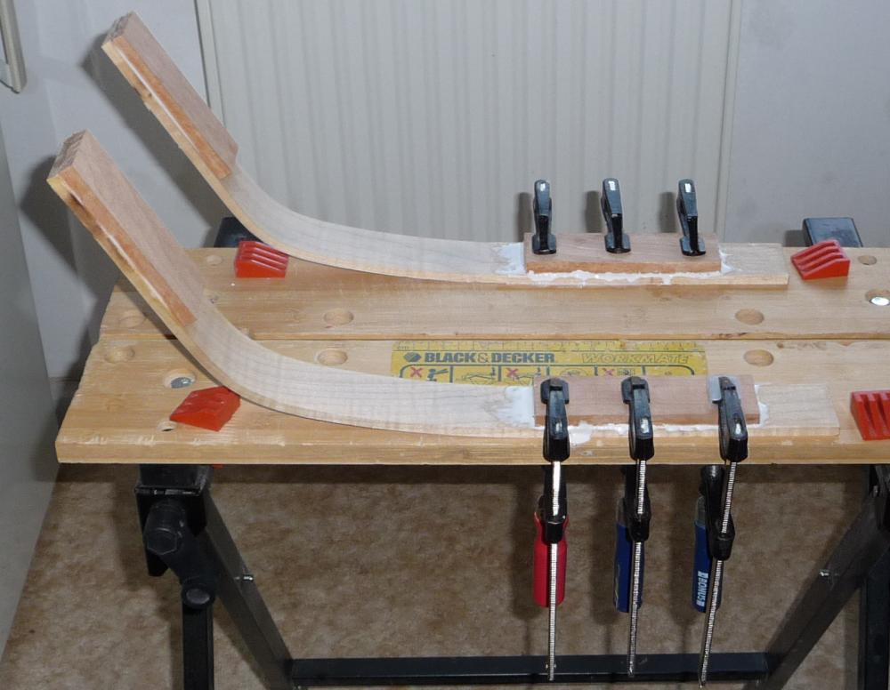 Dann die Stärke durch Laminieren aufgebaut. Weißleim (Ponal) wie hier zu sehen ist allerdings nicht sinnvoll wenn man die Sehnen hinterher mit Hautleim aufbringen will. Ich habe das später auch mit Hautleim gemacht aber nicht so schöne Bilder davon :)