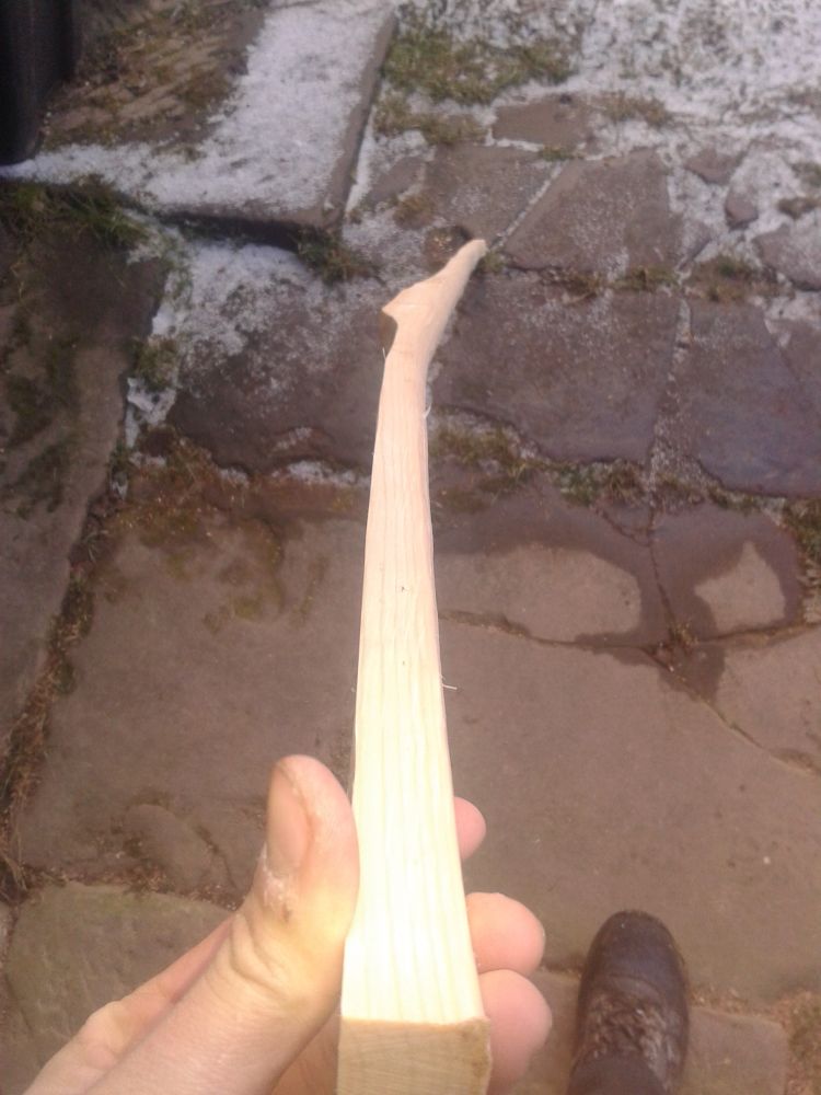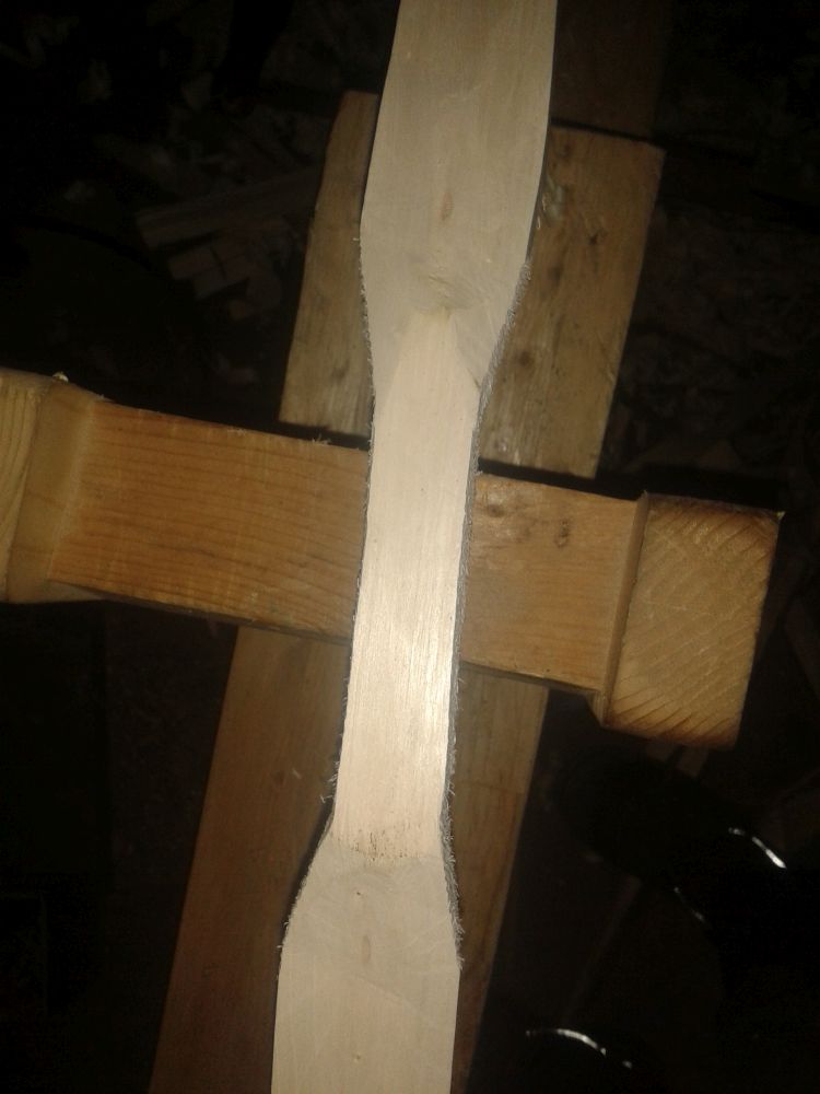 Habitus: Mal schnell gesägt: Und der Form halber: Detialbild der Rinde: Dann schnell heimgelatscht und den Zünftigen Griff angezeichnet: Bogenrücken raussuchen: Und den Bauch so weit wie möglich wegschneiden: In Folge dessen auch schonmal die Griffdicke reduzieren: Dann noch entrinden und etwas seitlich zum Ende hin verschmälern, dann sieht das so aus: Gewicht momentan: 1273g