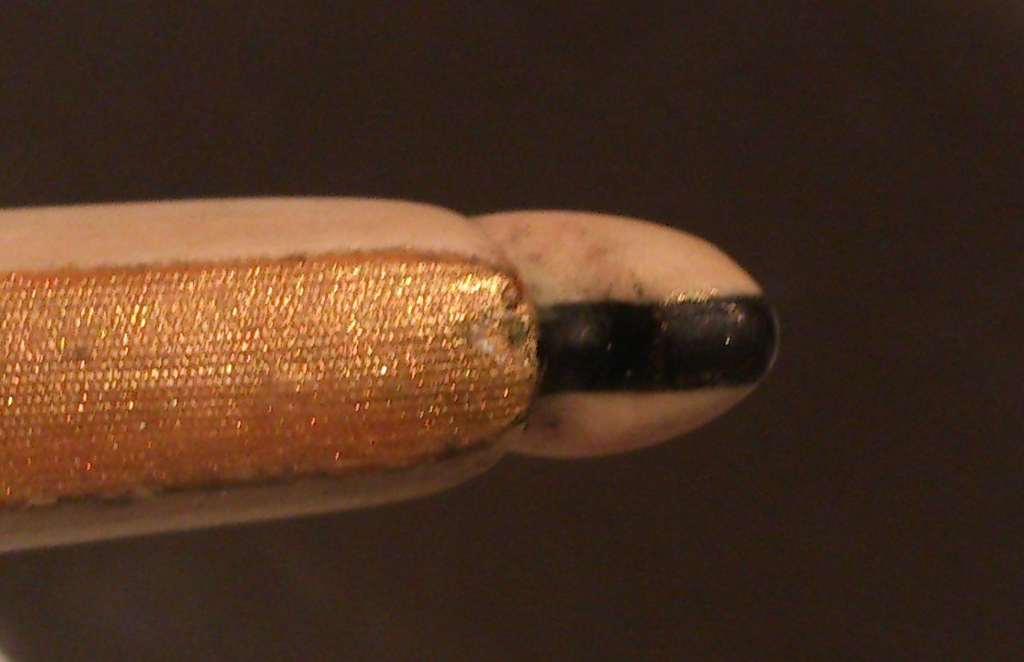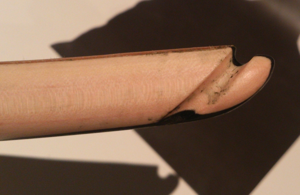 Also hab ich einen Längsschnitt gemacht und Pfeilnock-Verstärkungshorn eingebaut. Aber etwas anders als üblich eingebaut - seht selbst. Das Seidenbacking hab ich mit Ponal Blau und Goldpigmenten eingepinselt.