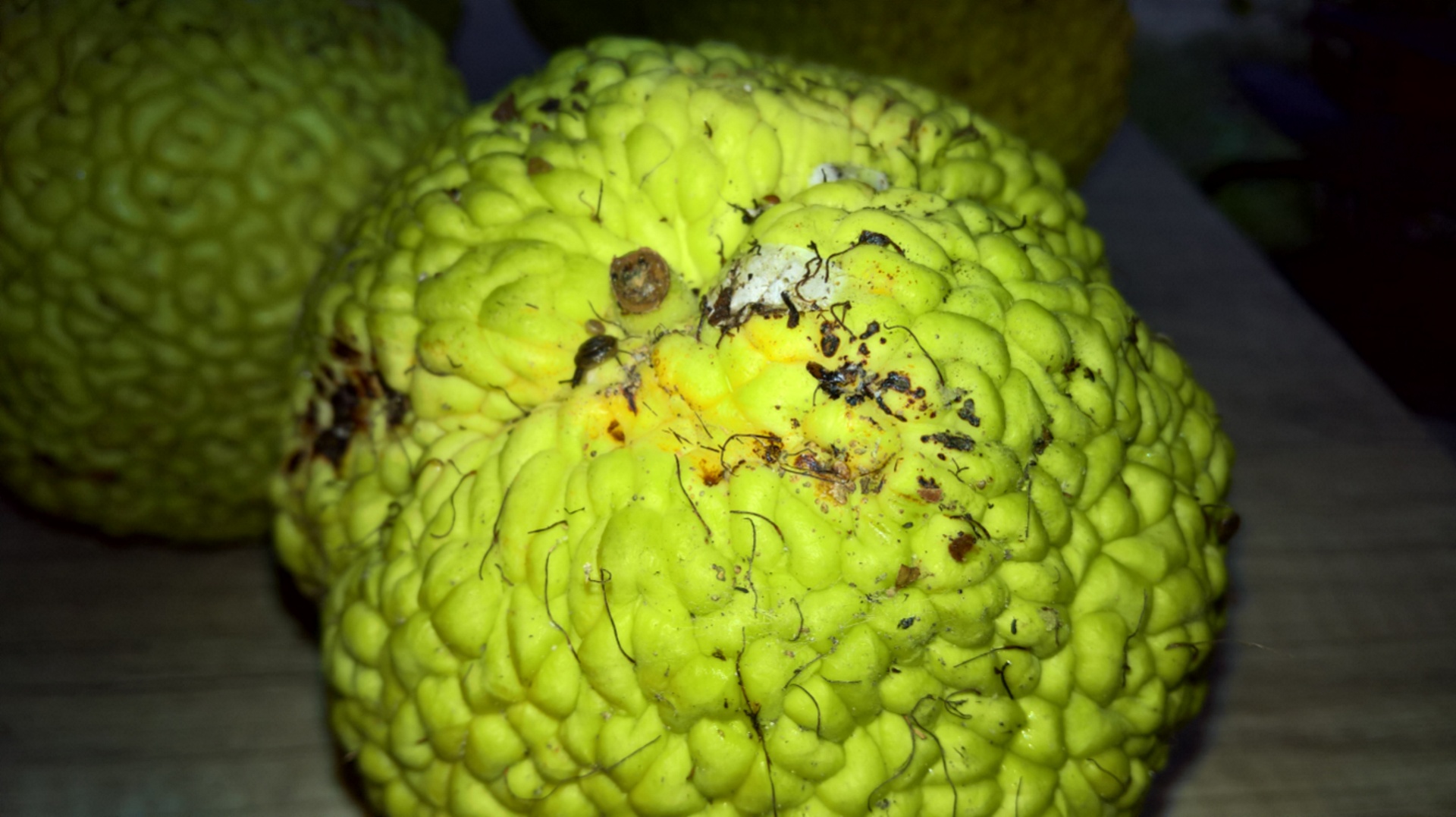 Nachdem ich dieses Jahr verspäteten Urlaub habe, ist mir am Montag bei wunderschönem Oktoberlicht eine Osagefrucht vors Auto gelaufen.