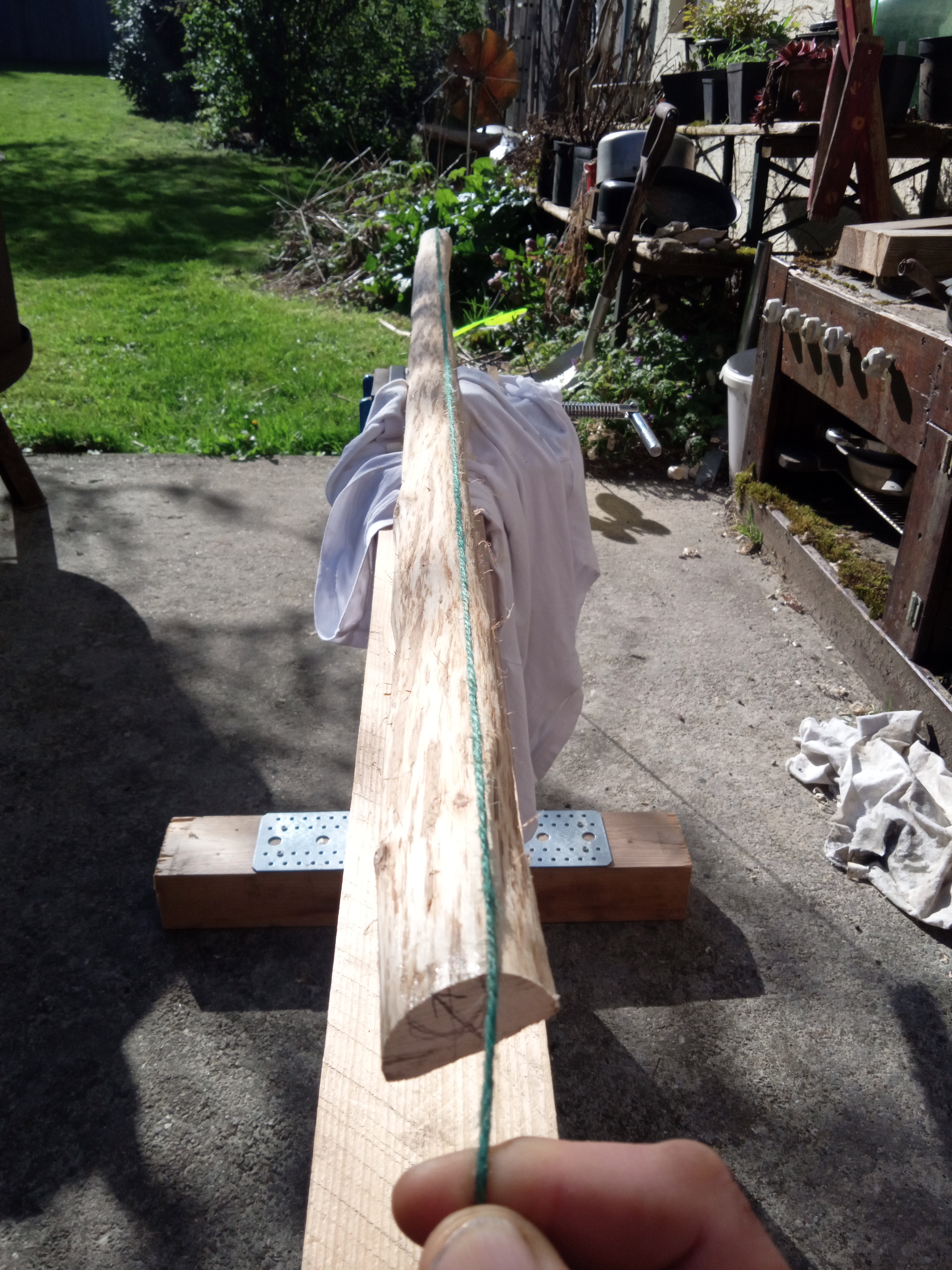 Sehne leider immer noch leicht außermittig und nicht wirklich halbpyramidal. Eher so 40:60 parallel zu pyramidal. Das ging wegen einem seitlichen Ausriss leider nicht anders. Breite an den Tips ist jetzt 15mm.