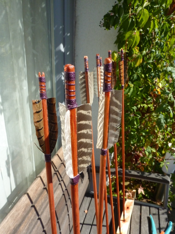Schäfte sind auf Rosenholz gebeizt (wie alle meine Pfeile) und mit Leinöl behandelt. Die eiernden Spitzen sind heiß eingepresst, allerdings hab ich mit dem Pech etwas getrickst - das ist keines, sieht nur so ähnlich aus. Die Wicklung sind Leinenfäden, das Finish drüber ist Weichselpech, gibt einen klaren glänzenden "Lack" der - zwar nicht wasserfest - aber glasklar aushärtet. Federn stammen vom Fasan und sind eher kurz geschnitten (3,5")
