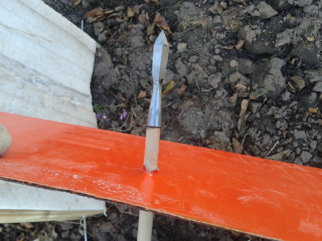 Die 1 mm wiesen sich schnell als zu schwach aus. War ein größeres Problem, den Pfeil wieder rauszukriegen, weil die Metallschneideschere aus der alten Schlosserwerkstatt gerade an der Spitze stumpf war. Uff. Also rumgefriemelt und schließlich rausbekommen.