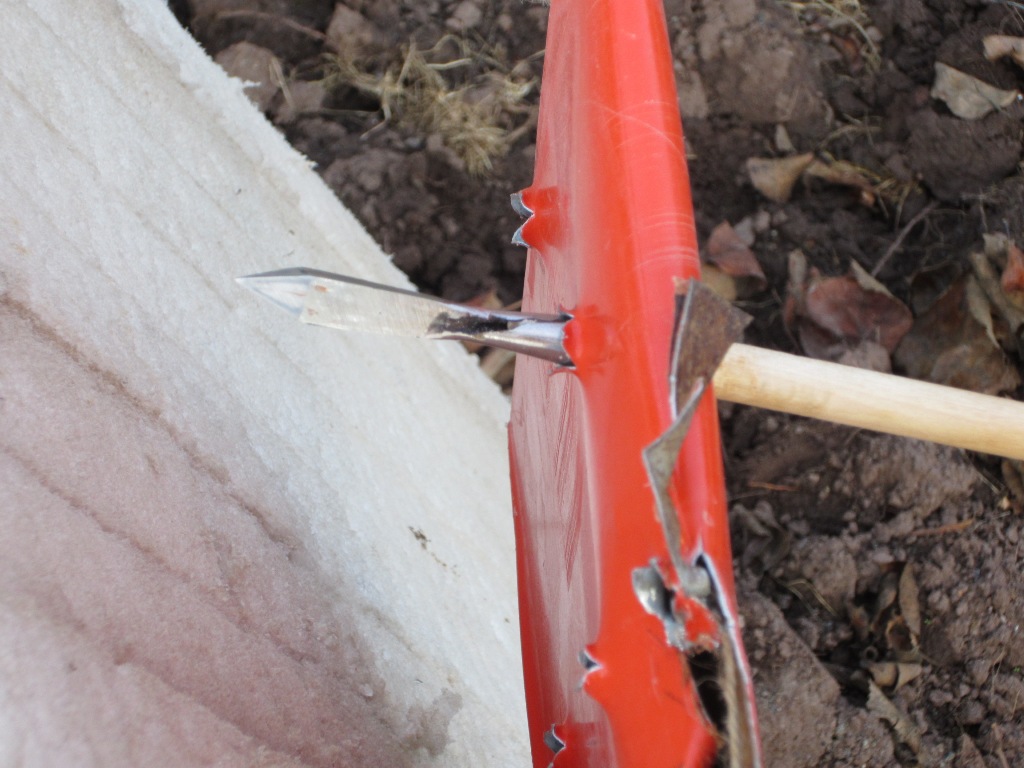 Da der Pfeil unbeschädigt war, entschlos ich mich dafür, das Teil doppelt zu nehmen. Der erste Schuss landete leider zimlich weit oben, wo das Blech am meisten in sich federte. Die Spitze durchdrung die zweite Lage folglich nur leicht.