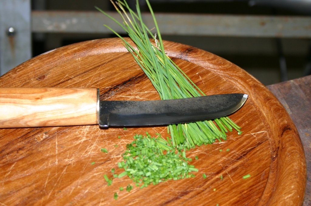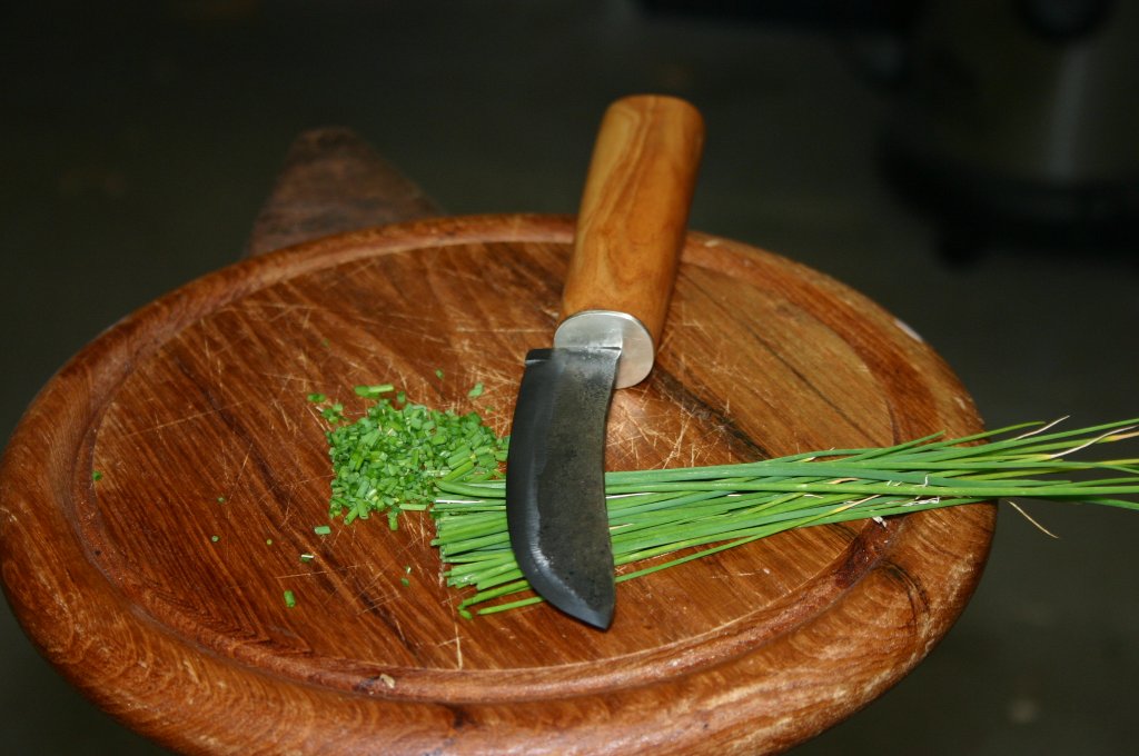hier ist mein neuestes Messer. Diesmal sollte es zu irgendwas nützlich sein, und gleichzeitig meiner Liebsten zeigen, dass all die Stunden in der Garage auch einen Sinn haben. Ich habe also ein Messer erschaffen, das tatsächlich Schnittlauch in kleine Ringe zerteilen kann. Ich nenne es mal ein Kräutermesser. Zugegeben, die Aufgabenstellung war nicht so schwer, aber ich bin trotzdem stolz drauf.