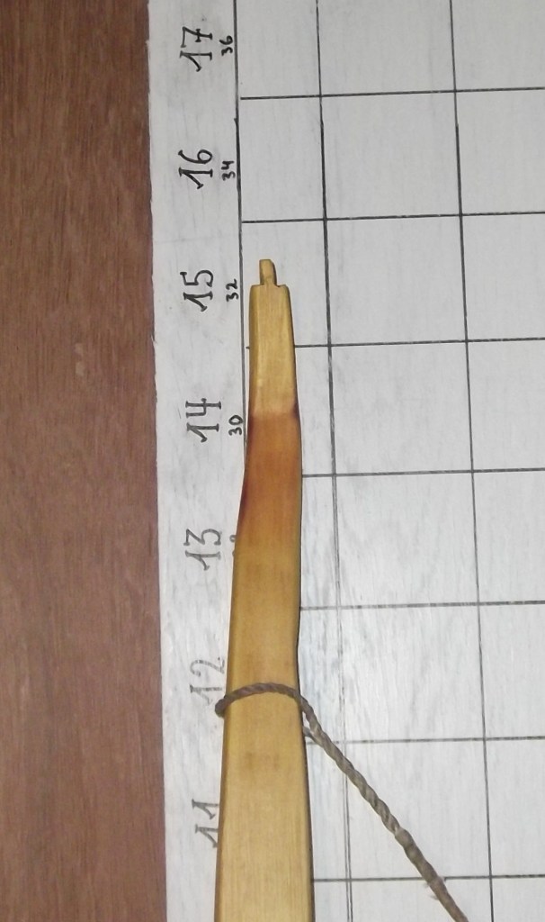 Durch einen snaky geformten "Schlenker im Holz ziemlich genau in der mitte war schon von vornherein klar, daß dieser als Langbogen mit steifen Griff und natürlichem Schußfenster (FAST schon ein Centershot) gebaut werden wollte.