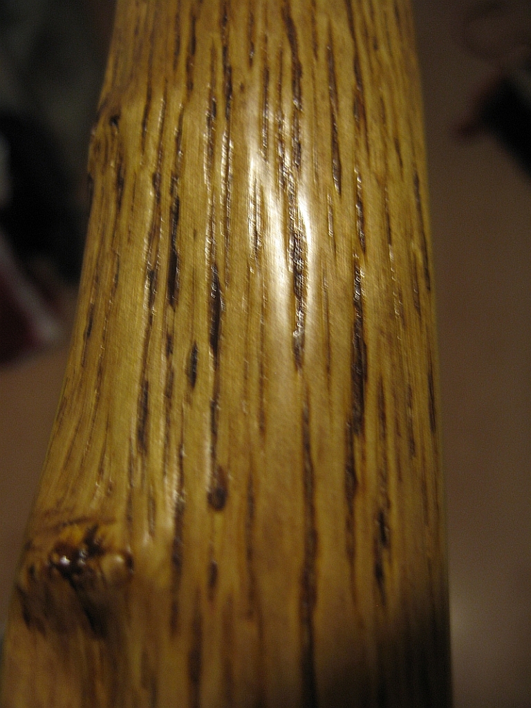 Als ich vor 10 Jahren mal dachte 'leg die Esche um, trockne die, und bau bei Gelegenheit mal Bögen draus', da hab ich den Baum mit dem Reifmesser so derb vergewaltigt, dass ich im Nachhinein jetzt noch heulen könnte. Der Rückenring hätte sonst gut 7mm gehabt. Dagegen sieht die Hasel noch harmlos aus.