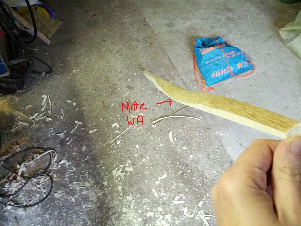 Der Bogen wird Halb-Pyramidal. 4 cm Breit (mehr geht nicht) und ab der Hälfte der Wurfarme schmaler auf 1,5cm an den Tips.