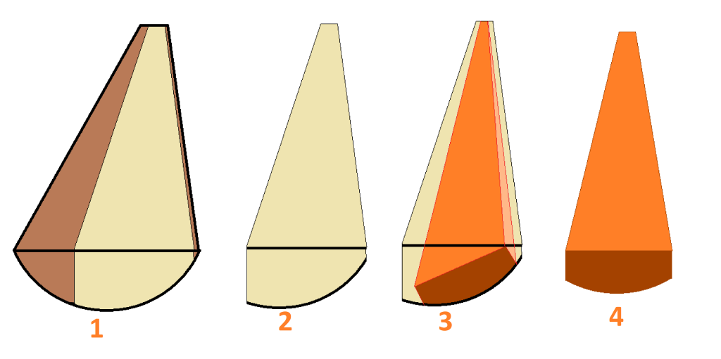 Frage: Nun muss ich teilweise nur einseitig Holz wegnehmen. Dort wird das Profil wie auf der nächsten Skizze aussehen. Muss ich die Kante dann so weit brechen, bis der Bogen symmetrisch ist (Grüne Markierung)? Jedoch würde damit der Jahresring durchtrennt und in der Mitte enden.