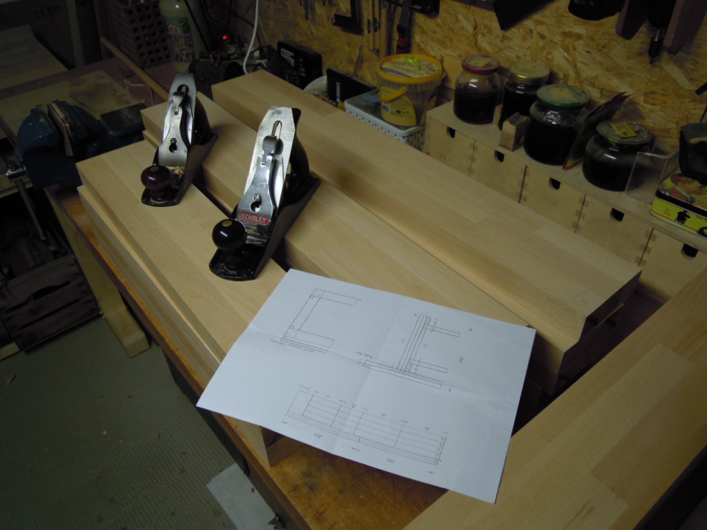 Je ein 88cm und ein 80cm Riegel werden verleimt. Leider habe ich keine Abrichte habe, musste ich mit Handhobel nacharbeiten. Durch den Faserwechsel des Leimholzes nicht ganz einfach.