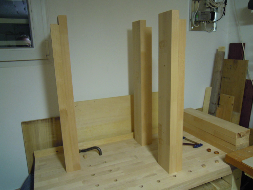 Um die Einlegeböden plan abschließen zu lassen, wird ein Falz in die Querstangen gehobelt. Die Querstangen wurden oben und unten noch mit je zwei Längsleisten und Dübel verbunden, so dass die Einlegeböden jeweils zwei weitere Auflagepunkte haben (keine Bilder :( )