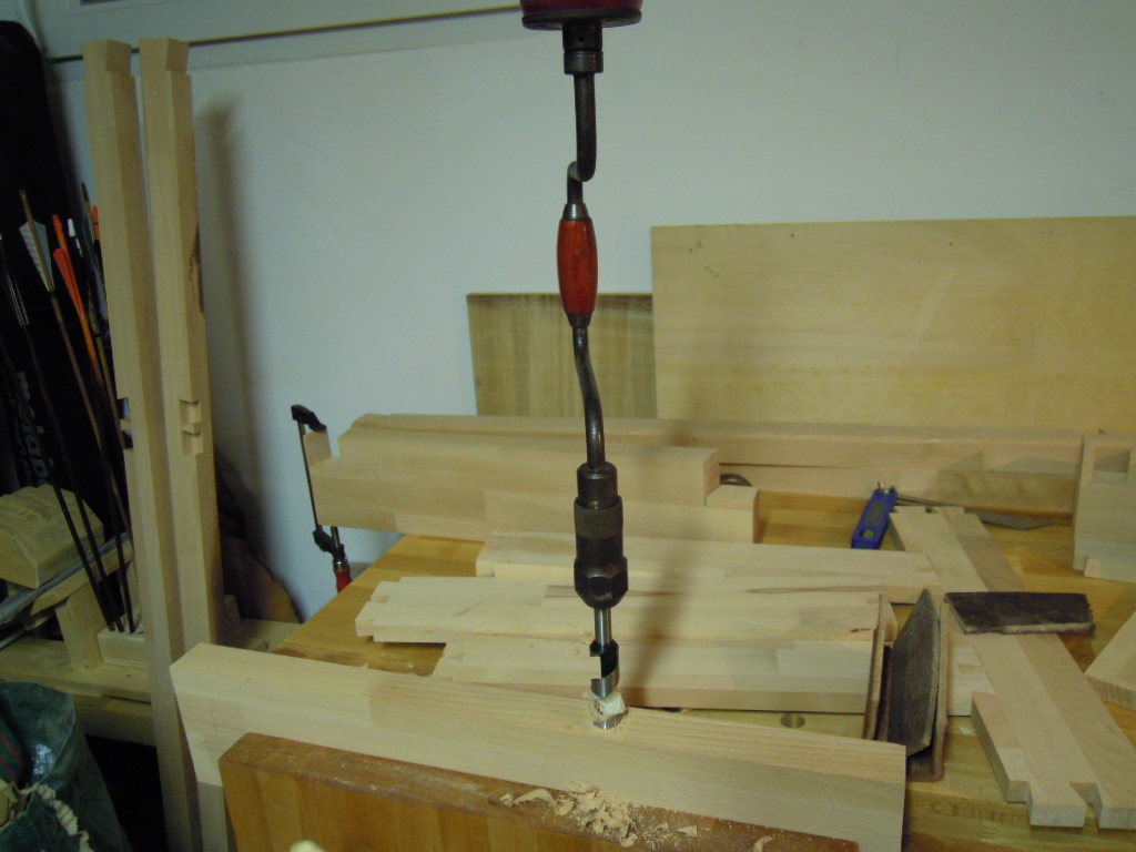 Damit das Werkstück ein Gegenlager hat wird der vom Zuschnitt der zweiten Platte vor die Führung der Vorderzange geschraubt und die Löcher für die Stangen mit dem Schlangenbohrer ausgeführt. Die Löcher der Holzschrauben werden mit einem alten Schaft eines Fichtenpfeils ausgefüllt, plan abgesägt und mit einem Stanley No.8 Schabhobel geglättet.