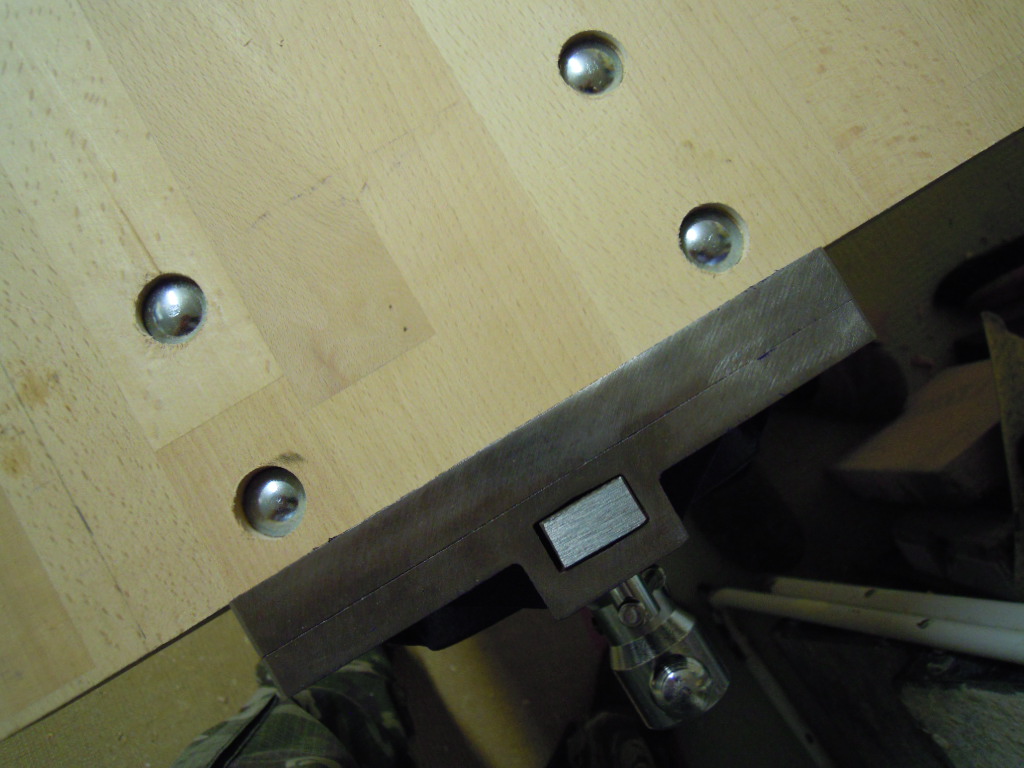 Die entsprechenden Löcher kommen in die untere der zwei Arbeitsplatten. Die obere Platte deckt diese optisch nicht ganz ansprechende Verbindung ab.