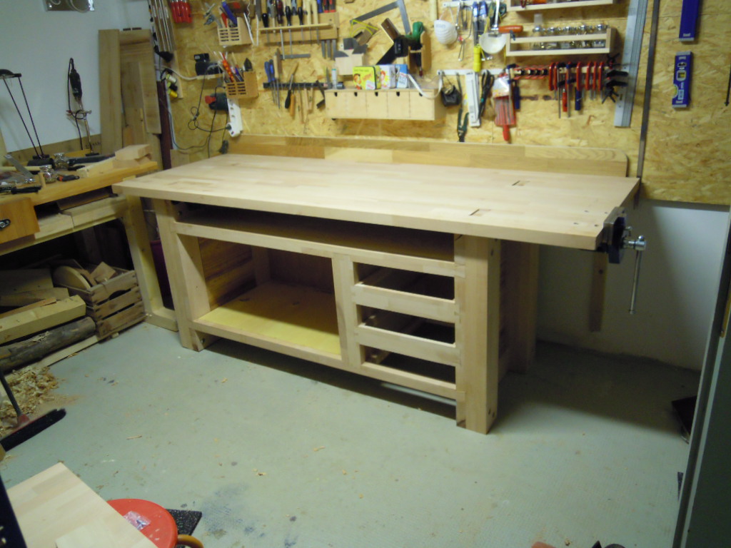 Die Werkbank besteht aus drei Buchenleimplatten mit 4cm Stärke. Der Unterbau verschlingt die erste, die Arbeitsplatte die beiden anderen. Die Bank enthält zwei Zangen, eine deutsche Vorderzange und einen Tischlerschraubstock. Die Schubladen und die Türen entstammen einer guten alten Kommode die zuvor den Unterbau meiner alten Werkbank darstellte. Die Werkbank hat mit den zwei Zangen und dem weiteren Material (Holz, Bohrer, Hartöl, Schrauben) etwa 500€ gekostet.