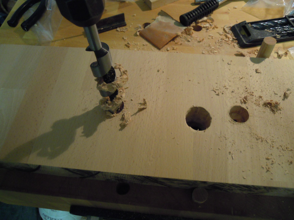 Für die Bankhaken kommen nun reichlich 19mm Löcher zum Einsatz (Ich hab jetzt übrigens Arme wie Preisboxer ;D ). Immer schön senkrecht!