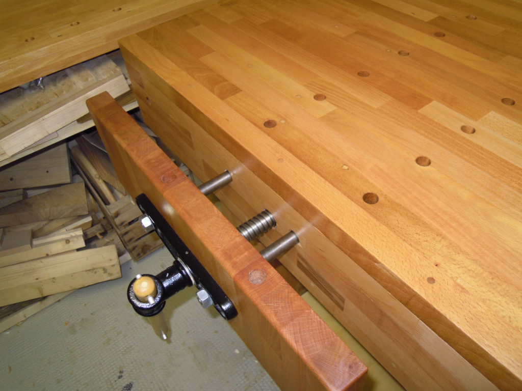Die untere Platte wird von 300x90cm auf 225x77cm zugesägt. Der Tischlerschraubstock wird mit Schlossschrauben durch die Arbeitsplatte solide verbunden