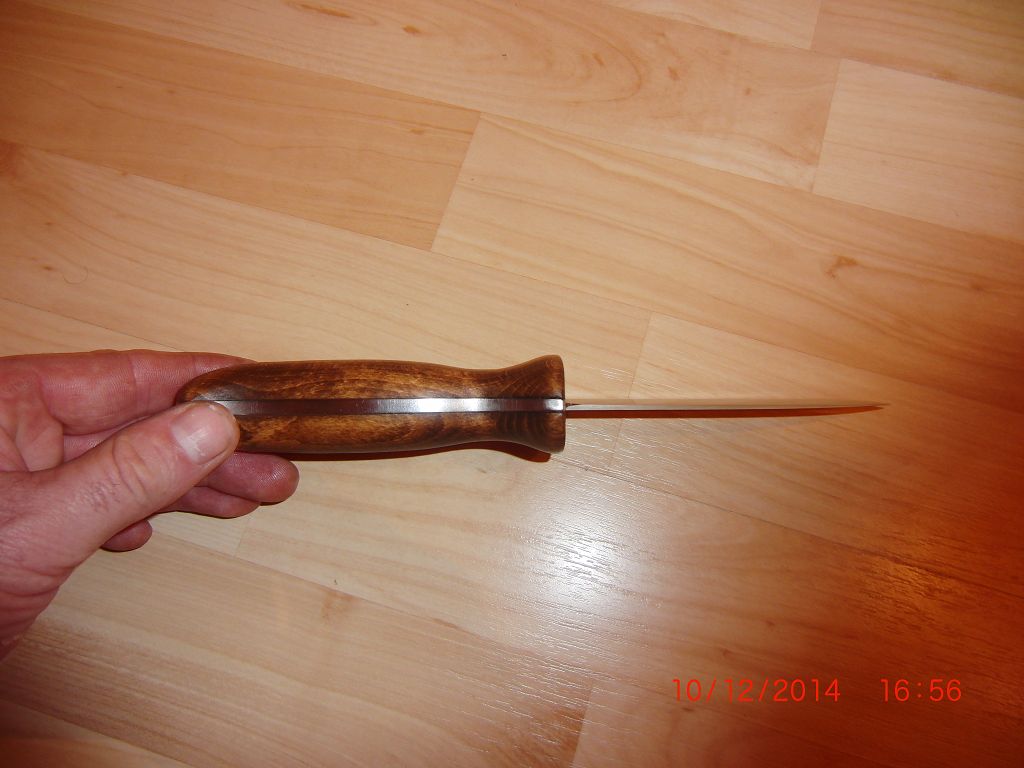 Nachdem ich nun mehrere Armbrüste gebaut habe wollte ich mal was anderes machen. Also kam mir die Idee ein Messer zu bauen obwohl ich keinen Mangel an Messern habe. Aber zu einem Eigenbau egal was das ist hat man einen anderen Bezug. Also habe ich vielgelesen über geeignete Messerstähle. Wollte aber einen Stahl nehmen den ich schon da habe. Ich hab mich dann für ein Reststück Federstahl vom Bogenbau für eine meiner ABs entschieden. Ich hab aber auch gelesen das Federstahl für Messerklingen nicht so gut geeignet sind. Es gibt so viele unterschiedliche Meinungen darüber. Ich habs einfach ausprobiert. Den Federstahl im Holzkohlefeuer ausgeglüht. Dann eine Schablone angefertigt und auf den Stahl übertragen und ausgeschnitten. Danach kam viel Feil und Schleifarbeit. Heute habe ich die Klinge im Holzkohlefeuer gehärtet. Kirschrotglühend und dann in Öl abgeschreckt. Danach im Backofen bei 210 Grad über eine Stunde angelassen. Nachden ich die Klinge nochmal geschärft hatte war ich mit dem Ergebnis sehr zufrieden. Es besteht mühelos den Papiertest. Selbst als ich noch an einem Holzstück rumgeschnitzt habe ging es immer noch gut durchs Papier. Hier ein paar Daten.