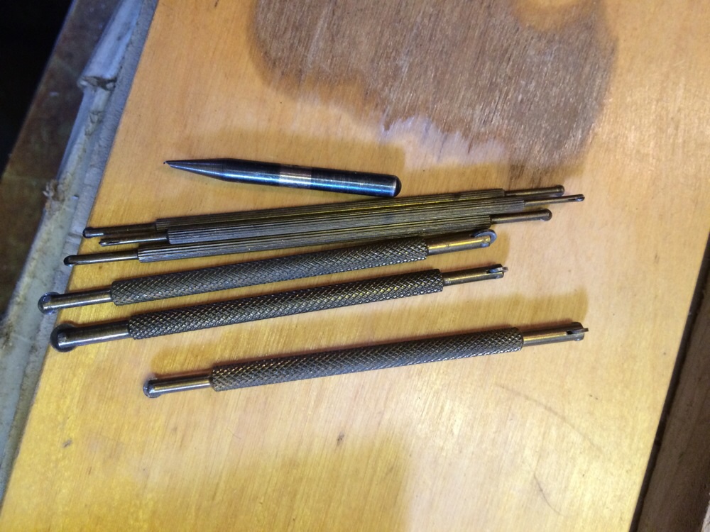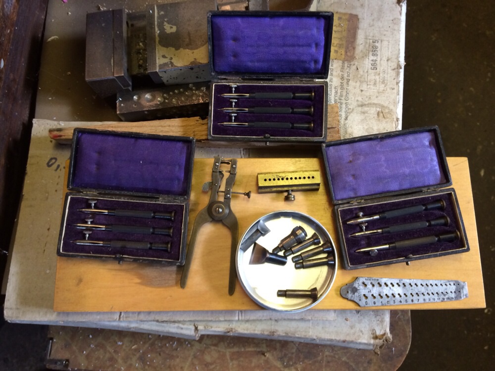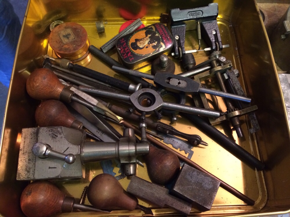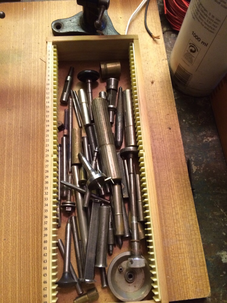 also das "Krimskrams-Zeug"... Steinpresse, Nietbänkchen, Fassungsöffner/-schliesser (in den Samtkästchen), Aussen-Gewindeschneider (ohne passendes Werkzeug für Innengewinde?),... geht meist für Taschengeld weg - es sei denn man findet zufällig jemanden der es wirklich braucht.