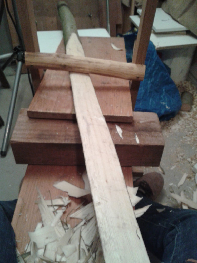 Also der Plan ist: Einen Bogen aus nassem Holz gleich fertig schnitzen, dann den Bogenbauch mit einer Hitzequelle rösten und damit gleichzeitig zu trocknen. Meine Hoffnung ist, dass sich durch den trockenen Bauch nur wenig Set entwickelt.