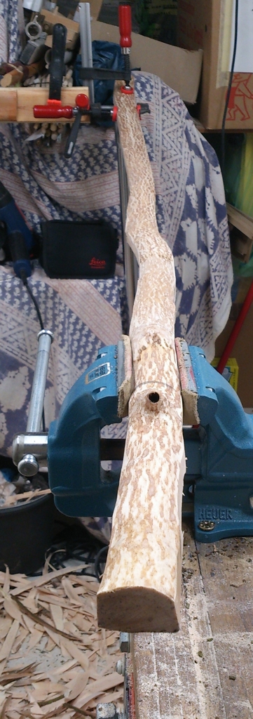 Eine Biegung sollte es noch werden, um eine für mich sehr ungünstige deflexe Stelle zu korrigieren und das hat nicht so geklappt wie geplant. Aber nicht, weil sichs nicht hätte biegen lassen, sondern weils Holz sich beim kochen ein paar cm in die alte Lage zurückgezogen hat und ich es dann nicht innerhalb der kurzen zur Verfügung stehenden Zeit geschafft habe das Holz in die Hilfskonstruktion einzuspannen. Und dieser Umstand hat dann einen Wutanfall nach sich gezogen und zur sofortigen Exekution des Hartriegel geführt - so isses halt manchmal ::)