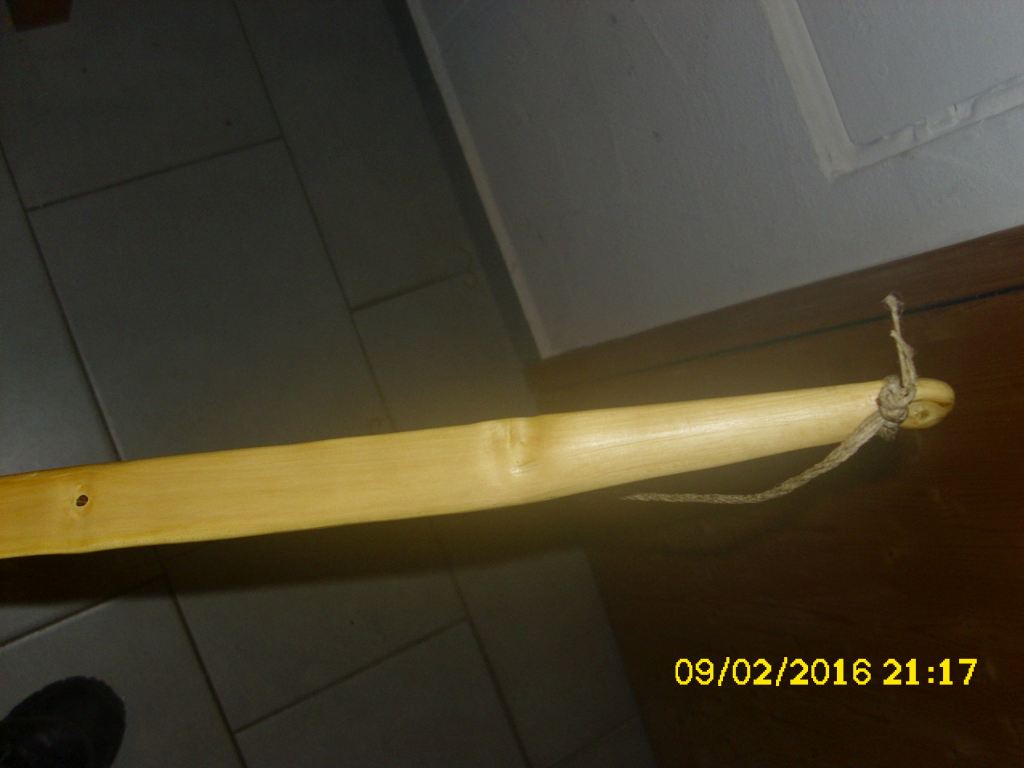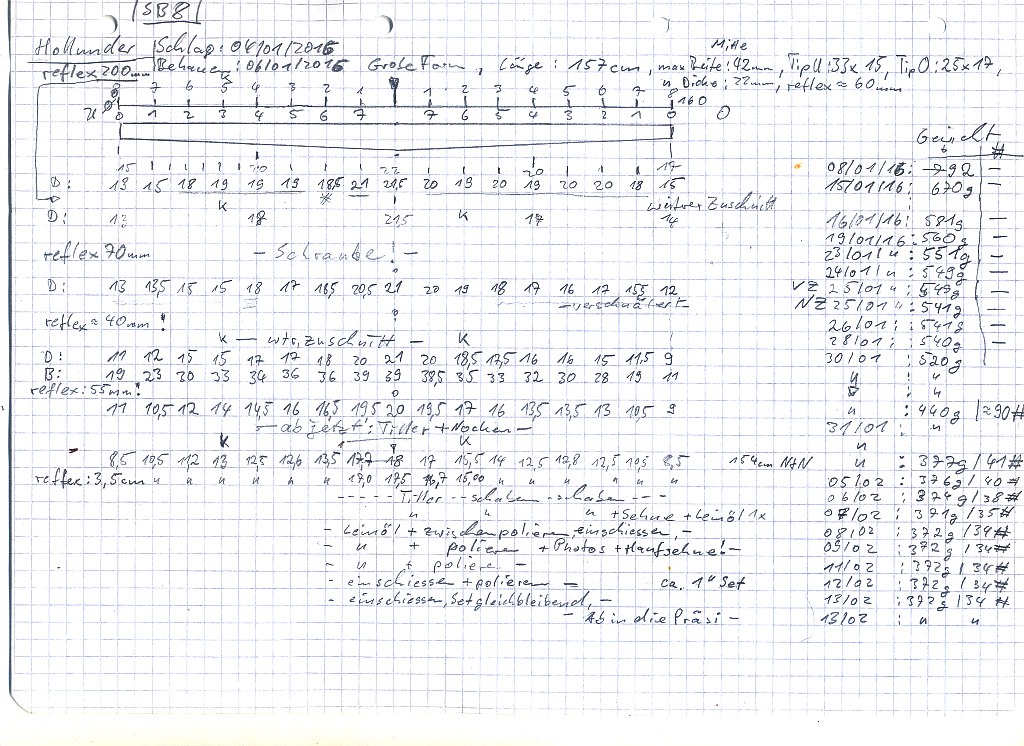 - Hauptstamm Holler (nur noch 157cm) ist mittlerweile von 986g (06.01.2016,zurechtgehauen), auf 708g (heute) herunter, ziemlich snaky geworden,aber die Mittellinie durch den "Griff" (wird ja ein griffloser) stimmt immer noch wie vorausgesehen.Er wird immer reflexer, Jetzt schon 130mm, respektive ca. 65mm für jedes Ende von der Mitte aus. Dicke derzeit 22mm in der Mitte, 17mm an den Tips; gut viel Fleisch, wenn er will über 45#, wenn ich kann über 50#, mal sehen.... da war ja noch der faulige Stinketeil, mittlerweile fast weggeschnitten. Toitoitoi....