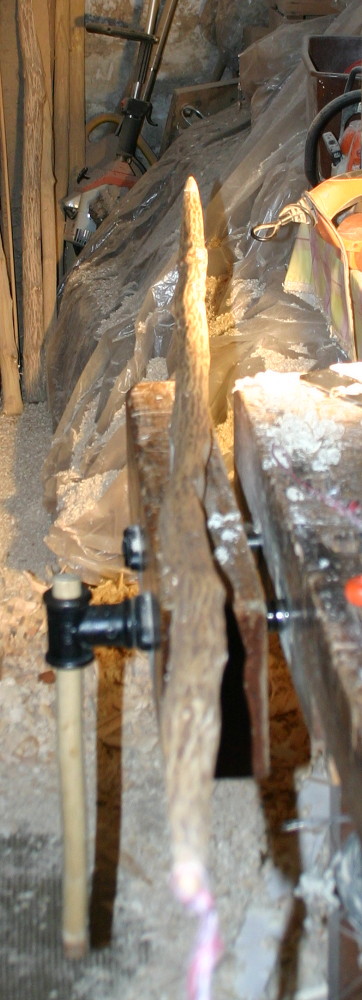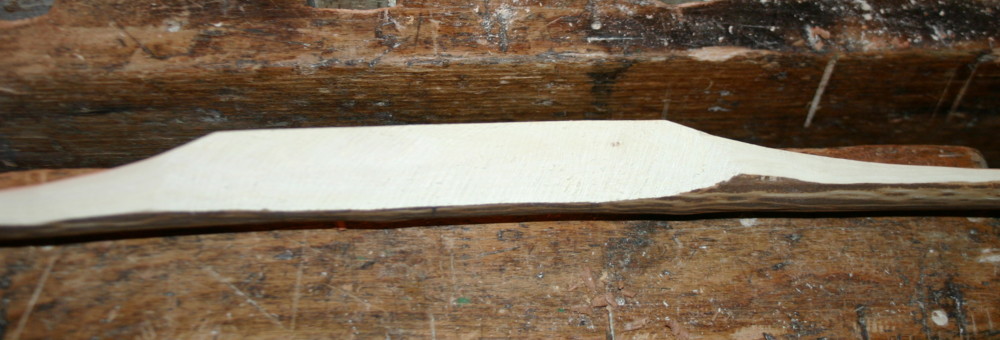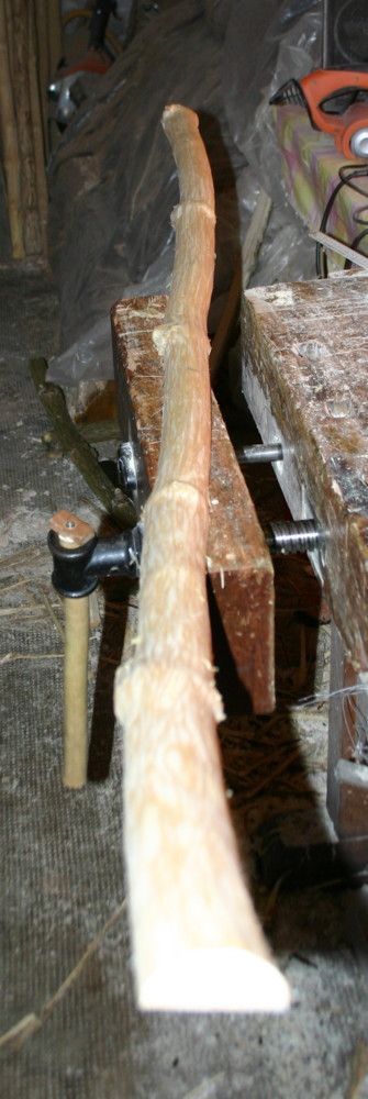 Zunächst habe ich meinen Hollerkandidaten etwas verschlankt, damit er besser trocknen kann. Auch die Sehnenlage passte noch, obwohl der Stave ja schon ne ordentliche Schlange ist.