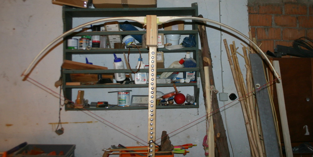 Edit: Grade fällt mir ein, dass meine Tochter gestern ein Bild im Vollauszug nach dem Einschießen gemacht hat. Ich habs mal gedreht. Es hängt leider etwas nach rechts. Ich finde, in der Perspektive siehts nicht mal schlecht aus. Der Hintergrund in meiner Werkstatt ist natürlich auch nicht ideal. Ich habe danach in der Mitte des unteren (rechten) Wurfarms noch etwas Material weggenommen und danach hats noch besser gepasst. Hier noch das Bild: