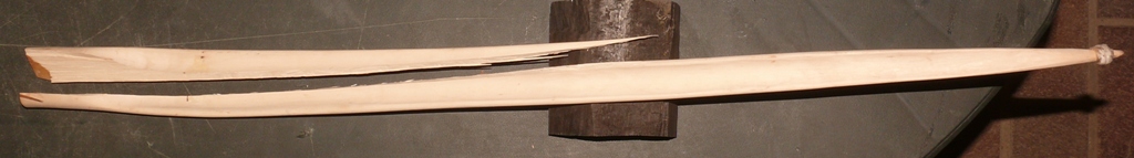 der erste Kandidat ist der Pfaffenhütchen - Bogen, der mir beim SapTurnier 2015 geplatzt ist - bzw. der übriggebliebene 2. Wurfarm davon: dann hab ich noch einen Versuch mit Hasel gestartet, der mir ebenfalls um die Ohren geflogen ist. Hier der (bis dahin überlebende) 2. Wurfarm:Die mögliche Biegung ist schon beachtlich...