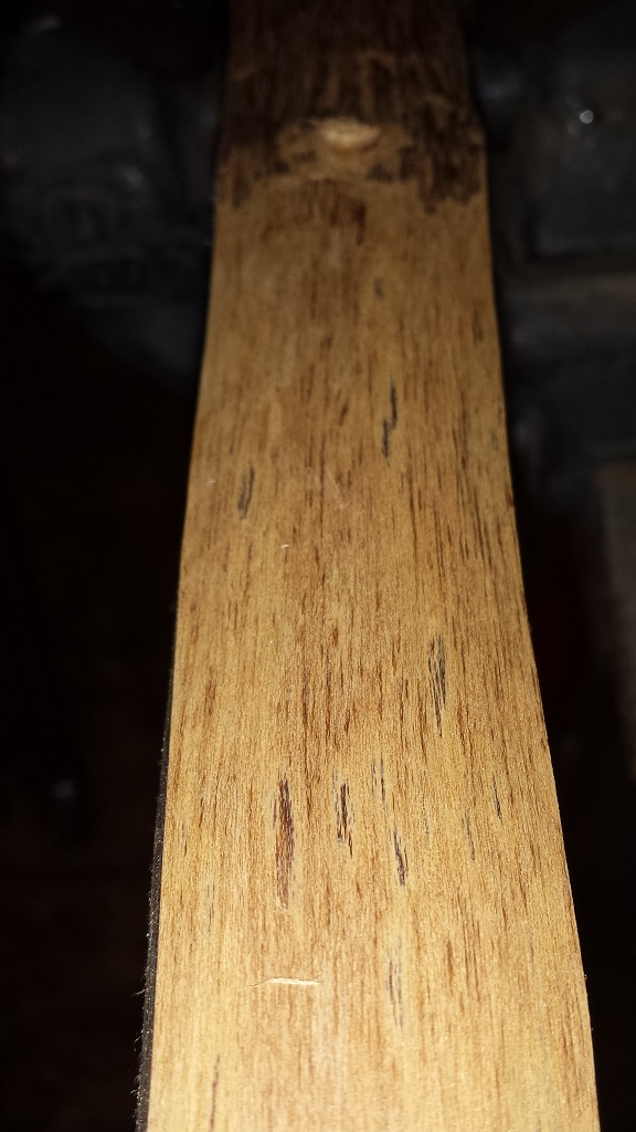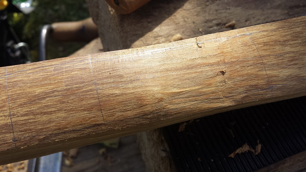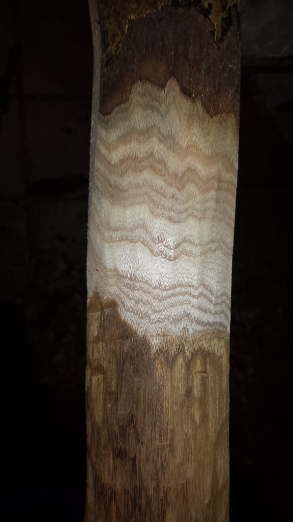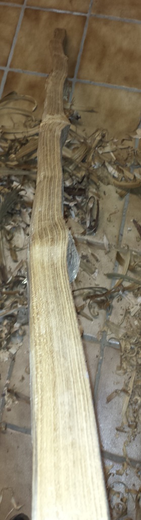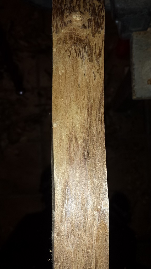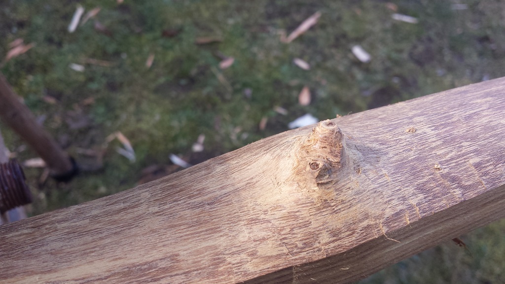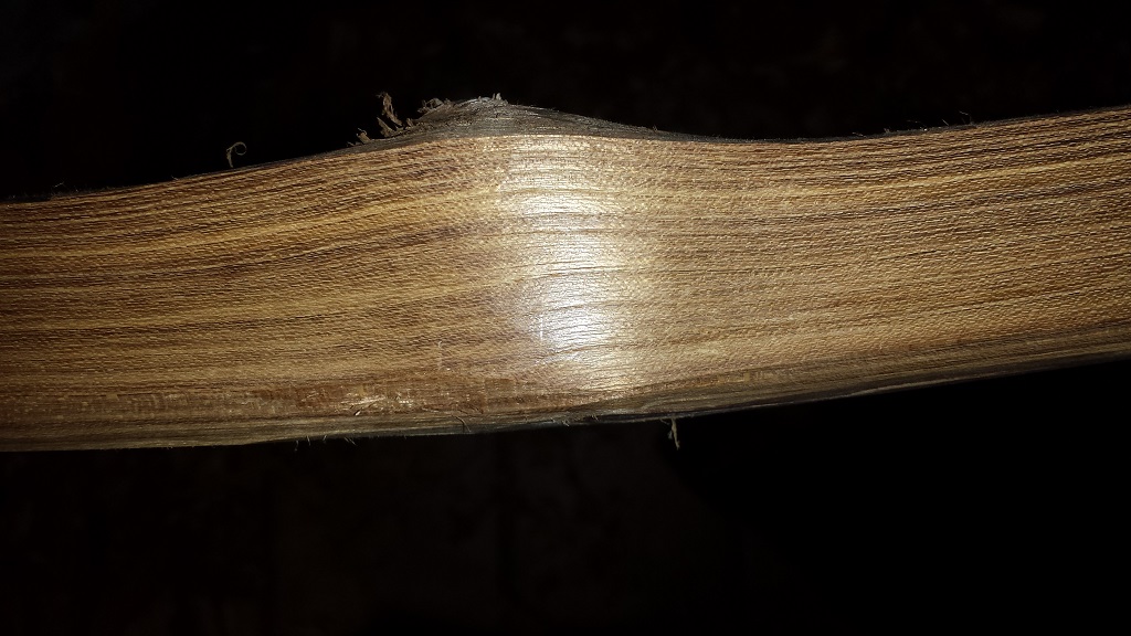 Erstmal den Splint runtermessern. Dieser ist wie schon im vorigen Post geschrieben zum Teil unbrauchbar. Der rest schneidet sich für Goldregen hervoragend und hätte bei optimaler Lagerung einen akzeptablen Bogenrücken gegeben welchen einen tollen Kontrast zum Kernholz gegeben hätte
