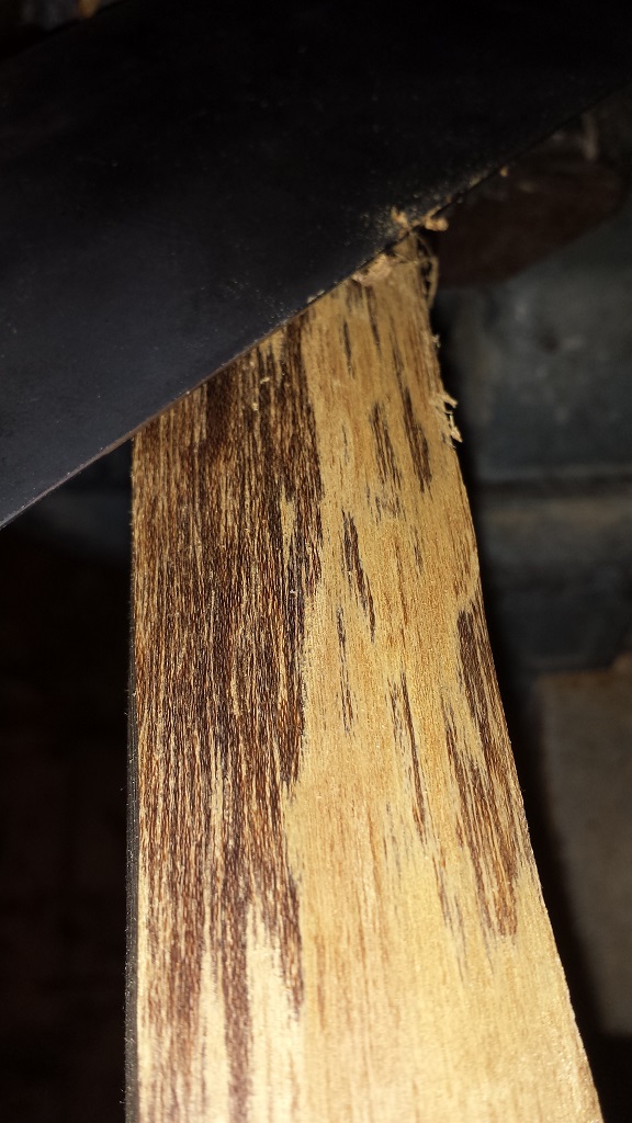 Hier die Seitenansicht. im oberen Bildteil sieht man warum der Splint runter muss. Der Stamm stand zu lange ungespalten und unversiegelt drausen und hat dadurch Blaufäule oder was auch immer eingefangen.