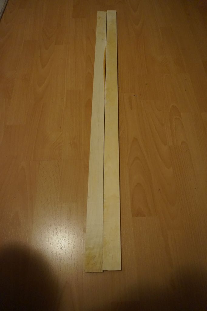 Ich bin an eine Ahorn gekommen , der einer Baustelle weichen musste. Habe ihn gespalten und er hat zum Glück keinen Drehwuchs. 2 Wurfarme habe ich bereits heraus geschnitten, mit liegenden Ringen und etwas Übermaß 50mm breit und 20mm dick. Ich hoffe ich bekomme noch 2 weiter heraus.