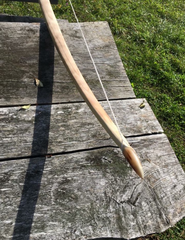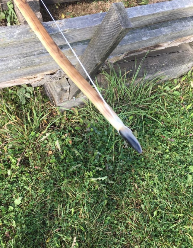 Und noch eine Bayerin hinterher: Die "Resl" ist ganze 822 g schwer (so mit allem drumunddran), aus Bergulme, 74" NtN lang, 38,5mm x 27,5mm in der Taille, 12mm rund an den Sidenocks (blond, Kuhhorn) und zieht 90 Pfund auf 32".
