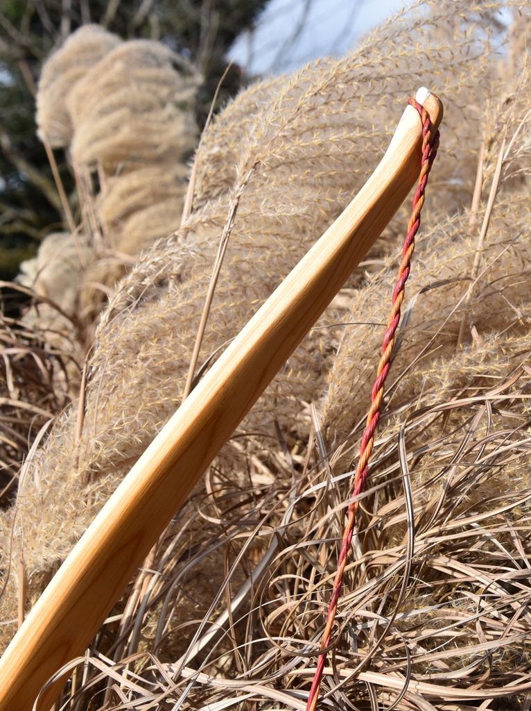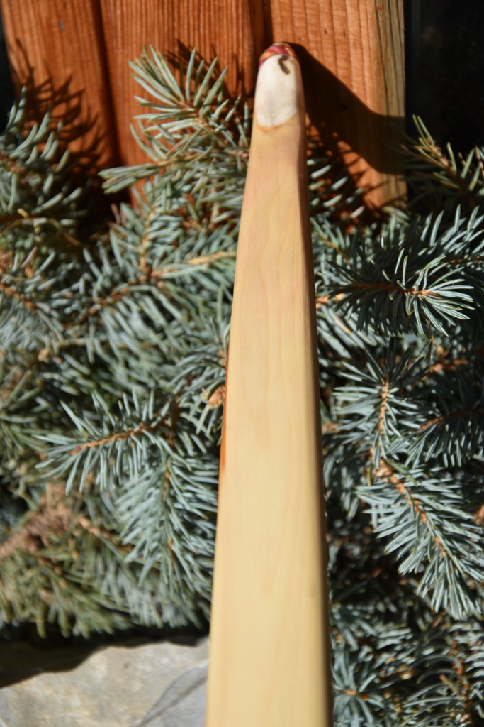 Dieser Bogen ist aus einem suboptimalen Stammstück gefertigt. Nach dem herausschneiden hat er sich stark verzogen. Unterschiedliche Splintdicke und ein grosser Ast am Ende machten die Arbeit auch nicht leichter. Es ist ein guter Stamm, so habe ich mich entschieden einen einfachen flachen Scheibenbogen zu machen.