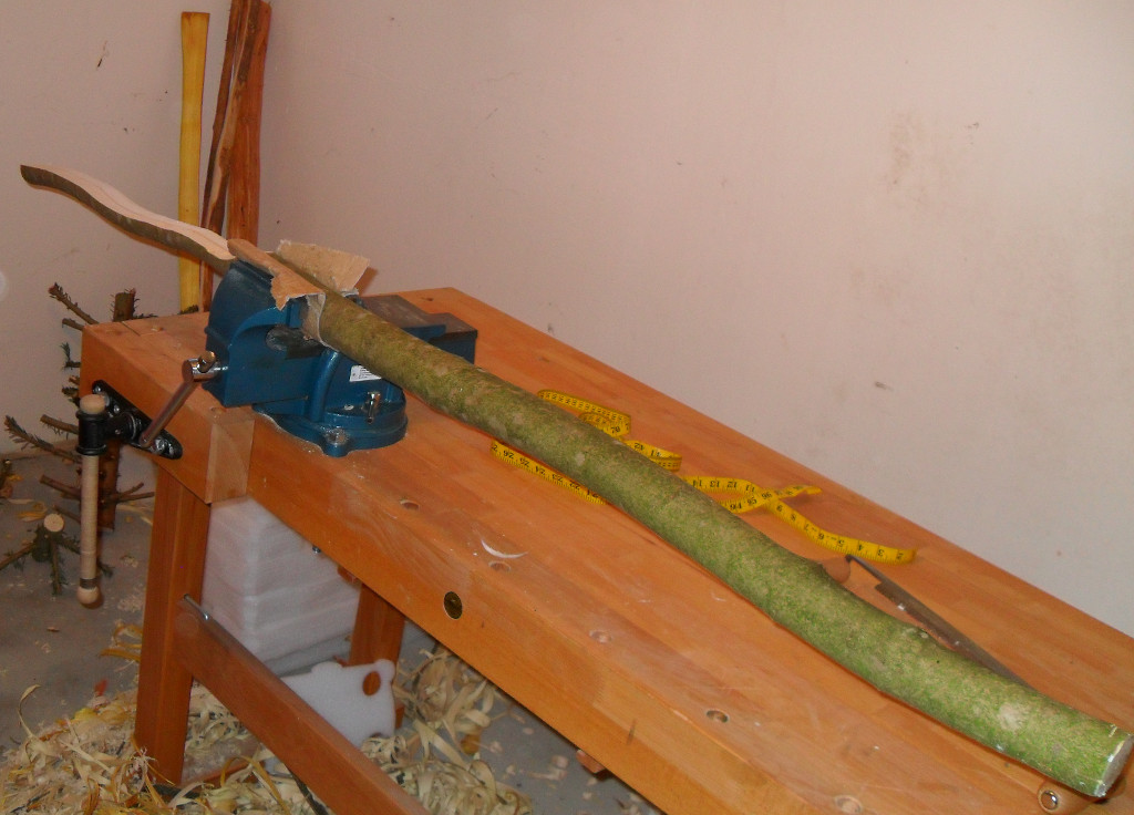 Dann geschepst (entrindet) und das Werkzeug : Und zum Schluß noch ein Entlastungsschnitt im Griff (nicht gezeigt) mit der Kinäsersag ..., dann leicht reflex eingespannt und die Schnittflächen mit Ponal zugepappt.