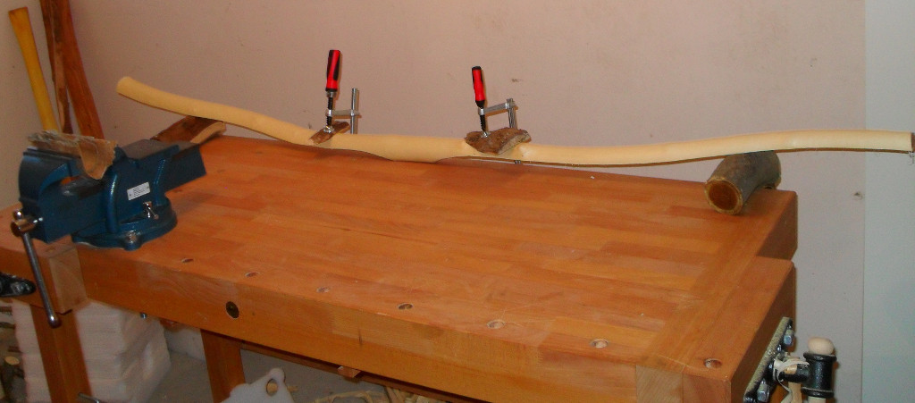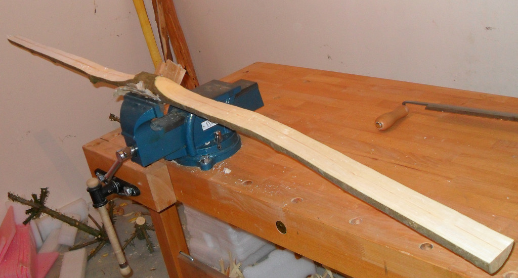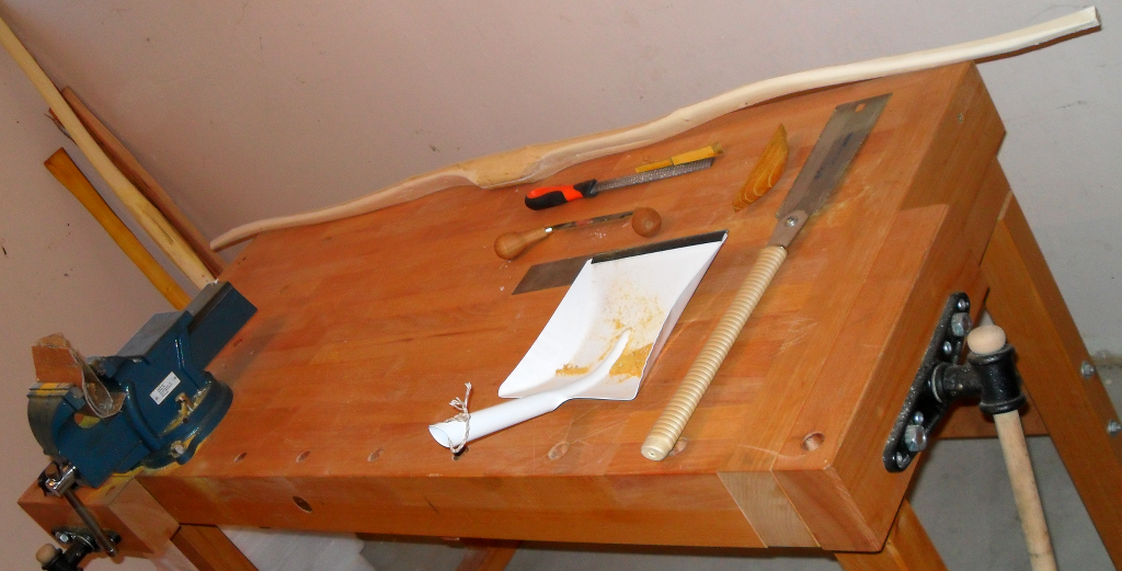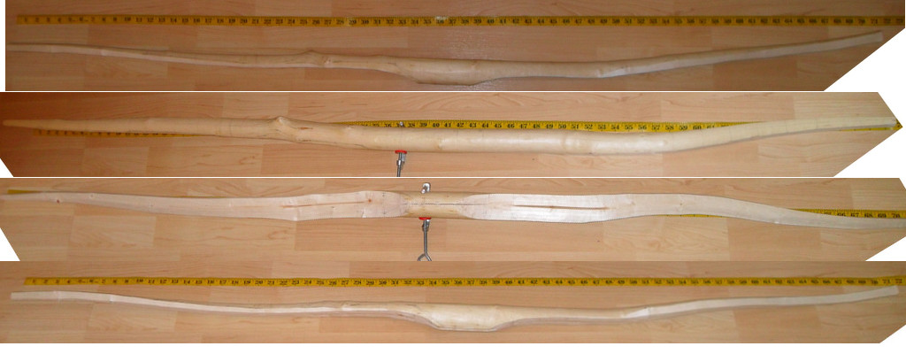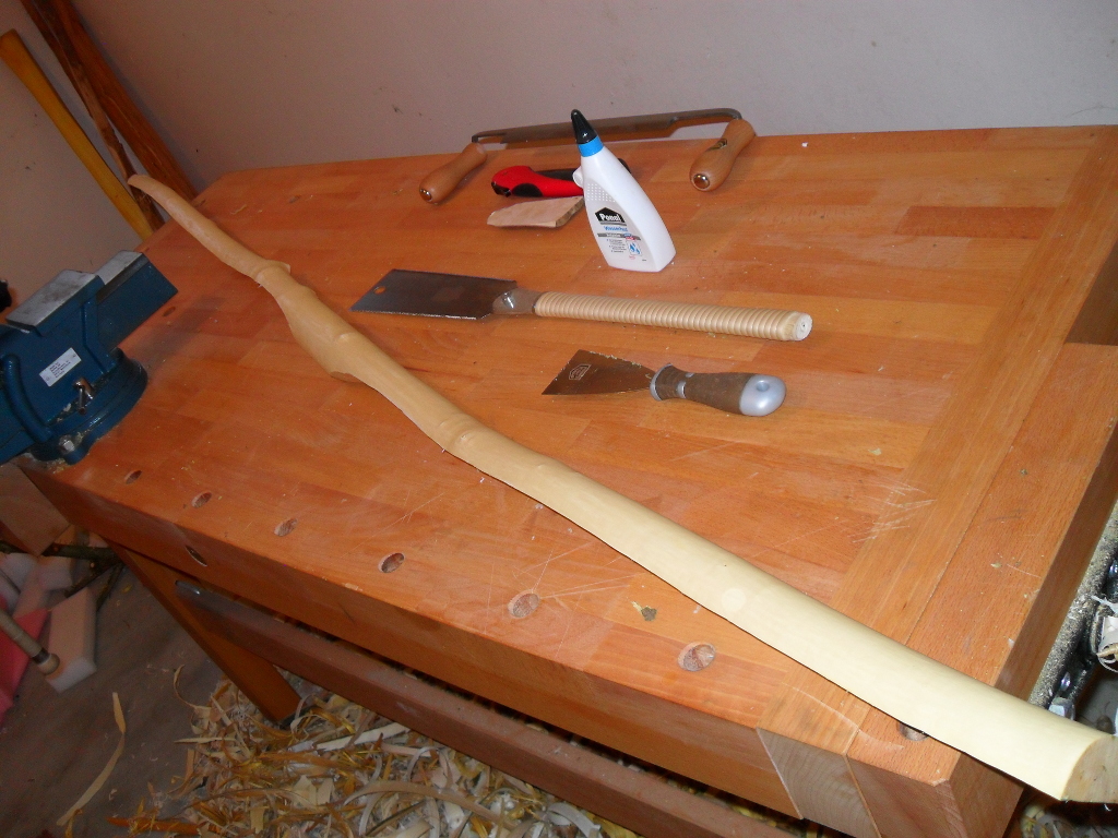 Heute hab ich ein bisschen Kanten gebrochen und mit dem kleinen Schnitzmesser und der Ziehklinge alles etwas vorgearbeitet (Dicke der WA angeglichen) und gerundet und erste Bodentillerversuche. Ausserdem hab ich mir ein paar Osageverschnitte zurechtgesägt.