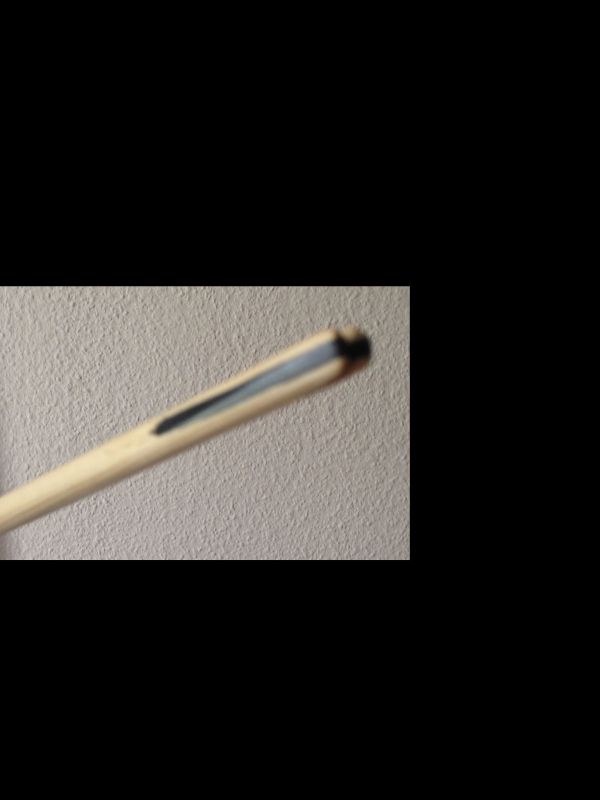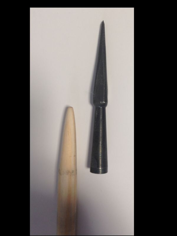Dann wollte ich die Spitze möglichst harmonisch an den Pfeil anpassen. Ich habe also einen Spitzentaper geschnitzt, damit der Schaft möglichst gut in die Tülle der Bodkin-Spitze passt. (Bild 1; Werkzeug: Taschenmesser).