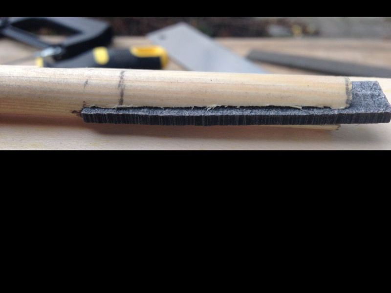 Ich hatte Lust, meinen ersten Selfnock mit Horninlay zu versuchen. Mit der Japansäge habe ich den Schaft längs eingesägt und mit der Fliesensäge den Schlitz erweitert. Dann habe ich ein wenig Horn zugeschnitten (Bild 2) und mit Eule endfest eingeklebt. Komplikation: Die Fliesensäge ist mir verlaufen, so dass das Inlay letztlich nicht besonders schön aussieht, sondern etwas schief im Schaft liegt (Bild 3).