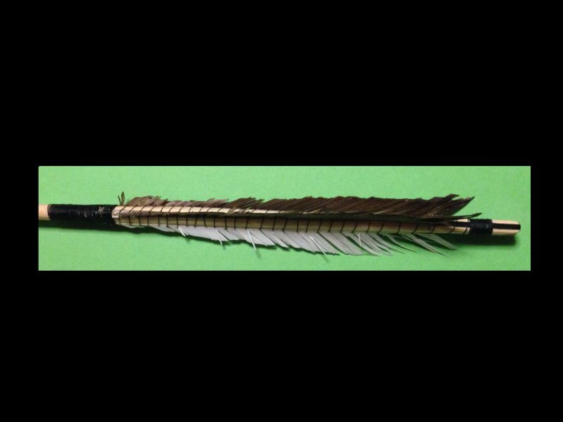 Pause. Meine Frau stellte mir einen ansehnlichen grippalen Infekt zur Verfügung und verschaffte mir damit einige Tage Auszeit. Danach ging es erst einmal auf ein auswärtiges Seminar, so dass ich mir bzw. dem Pfeil am vergangenen Wochenende den Rest in Form einer Na-ja-Federwicklung gegeben habe. Dafür habe ich ein ziemlich reißfestes Nähgarn verwendet. Diese elegante Art, eine Wicklung ohne Kleber zu sichern, habe ich leider nicht hinbekommen, also habe ich mit einem Tropfen Sekundenkleber gepfuscht. Und leider muss ich eingestehen, dass die Federn reichlich gerupft aussehen, obwohl ich mich vorher noch nach der Richtung des Fadens bei der Wicklung erkundigt und die Wicklung auch in der richtigen Richtung angebracht habe. Soweit die Wicklung durch die Federn verläuft, hätte es gleichmäßiger sein dürfen. Für das nächste Mal weiß ich, dass man die Strahlen vorher mit einer Nadel o.ä. auseinanderbringen sollte, bevor man den Wicklungsfaden zwischen die Strahlen schiebt. Die entsprechenden Darstellungen zeigen die Bilder ab 4.