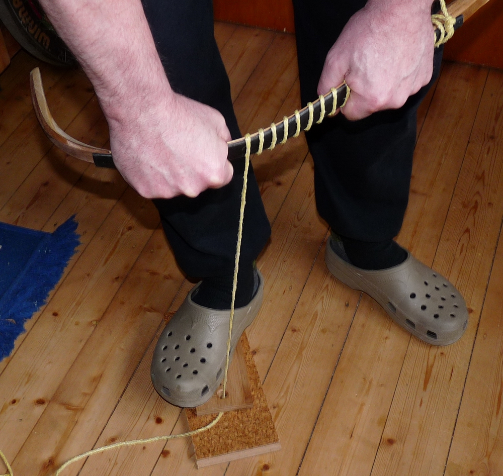 Hallo Markus! Nur am Griff eine zur Seilbefestigung und um den Anfang zu fixieren.Es geht sehr schnell und ohne Verwindung des Rahmens und der Druck reicht völlig aus. Zur besseren Druckverteilung klebe ich mit doppelseitigen Klebeband einen schmalen 3mm dicken Filzstreifen auf Horn und Holz.