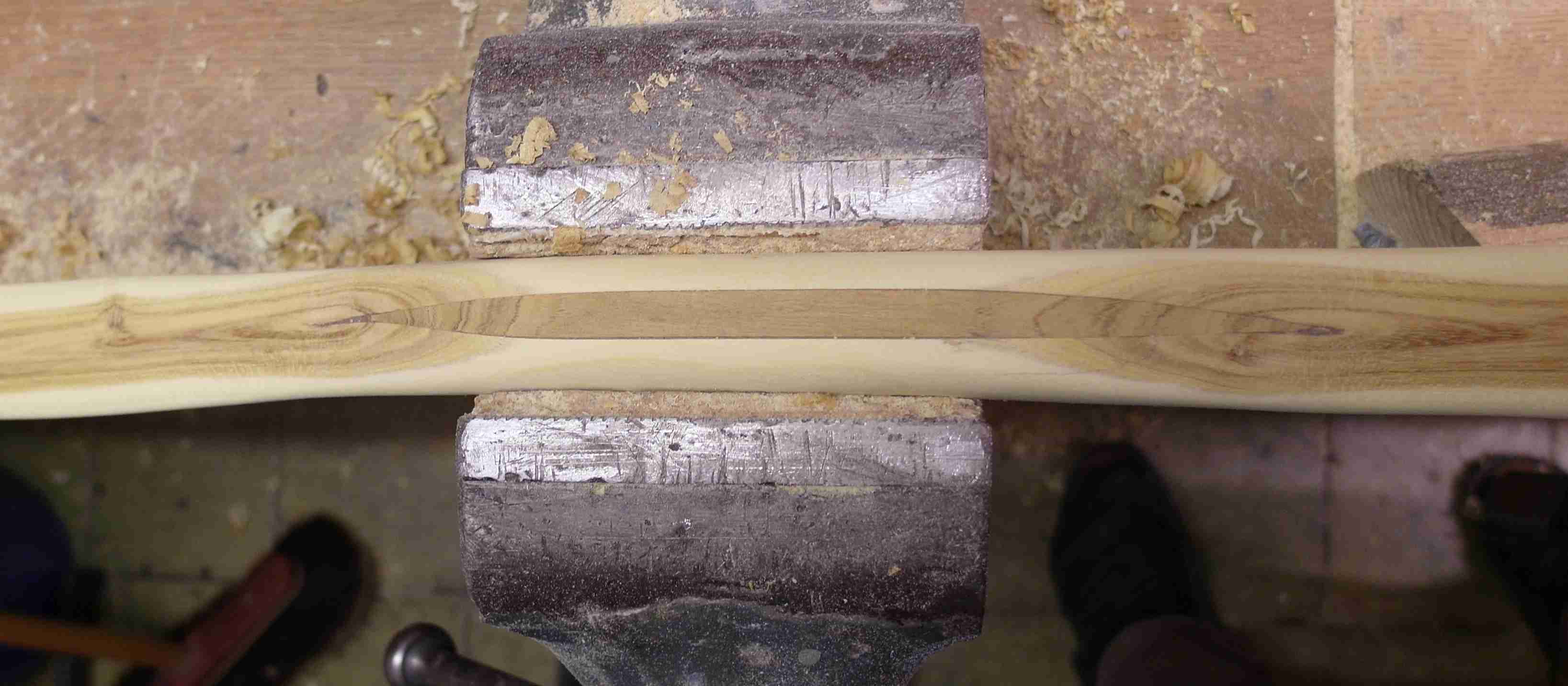 Aber erst noch ein Bild, warum ich Goldregen so liebe. Diese Farben... Nach dem Trocknen können sich manche wahrscheinlich denken, was kommt, genau: Aber es gibt immer ein erstes Mal, also mutig einen Schleifkeil gebaut und den Riss erweitert, einen Goldregenkeil eingepasst, mit Epoxid (Uhu 300 endfest) eingeklebt, eine Stunde beheizt (lang lebe der Halogenstrahler) und am nächsten Tag, mittlerweile war es Ende Januar, verschliffen, und tataa: Letztendlich bin ich froh um den Riss, denn durch die Entspannung ist der komplette Bogenrücken ist heil geblieben!