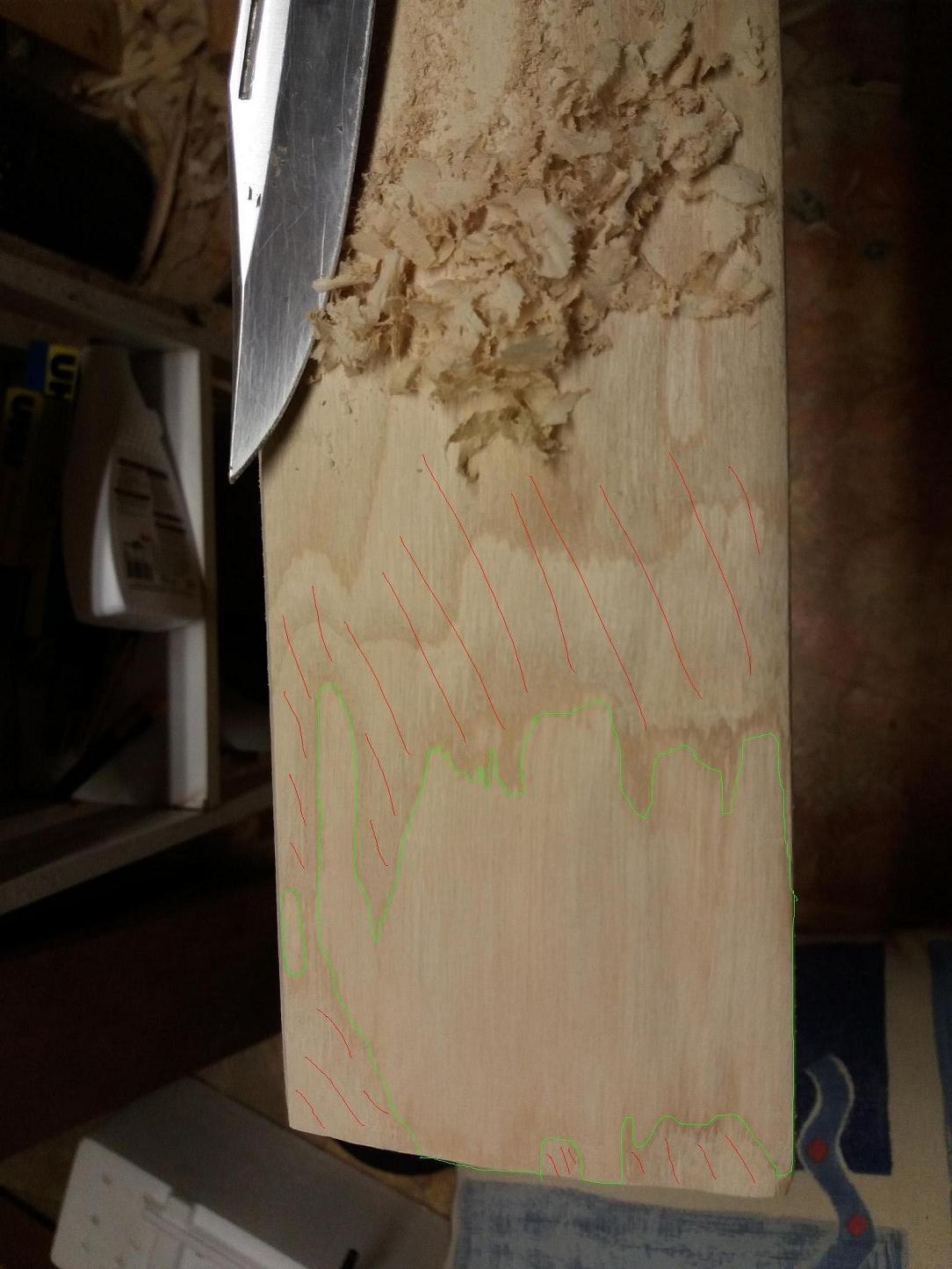 Achja - habe da noch ein Bild zu meinen Übungen ;) zum Freilegen des Spätholzringes noch am vollen Profil. Leider stand mir nur das Zieheisen und mein Pilzmesser mit kleinem angezogenen Grat zur Verfügung. Muss mir heute noch ein paar ordentliche Ziehklingen bestellen. Wollte mir so einen Satz von "Kirschen" holen. Hoffe, dass ich da nichts falsch mache. ??? Hier das Bild mit dem freigelegten Stück Rücken "in grüner Umrandung". ;)