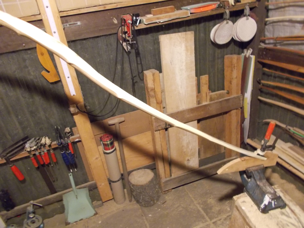 Ohne Hoffnung auf Erfolg habe ich heute weiter gemacht.Mal ne Tillerschnur raufgemacht und die Lage gepeilt. So siehts nun aus. Die letzte Biegerei um die Sehnenlage zu korrigieren hat nicht den gewünschten Erfolg gehabt, warum auch. Also volles Risiko und mich von dem Gedanken eines Flachbogens verabschiedet und soweit Holz von den Seiten mit Zieheisen abgetragen, bis die Sehne einigermaßen durch die Griffmitte läuft. Ein Tip ist ja schon reflex gewachsen (geflippt), deshalb die andere Seite in der Form fixiert und mit HLP erhitzt um sie genau so zu formen. Eine Verdrehung wollte ich auch gleich noch beheben, hat aber nicht geklappt, muß die HLP später noch mal ran. Beim Bodentiller biegen sich die WAs schon. Ich hab natürlich vor dem Biegen die WA-Enden auf 1cm Dicke reduziert, damit es leichter geht. Ansonsten mach ich mir bei dem Projekt keinen großen Kopf,Top oder Flop ist die Devise.