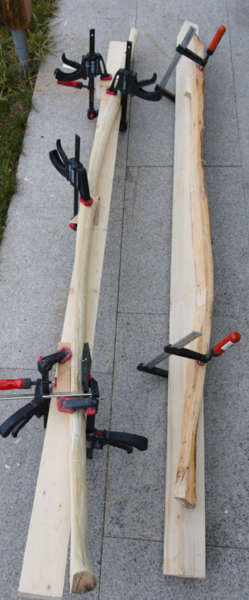 Die Bogenmitte habe ich extra so gelegt, das da nix biegt! Alle Äste und die Enden habe ich mit Holzleim versiegelt und den Stave wieder auf den Balken gespannt.