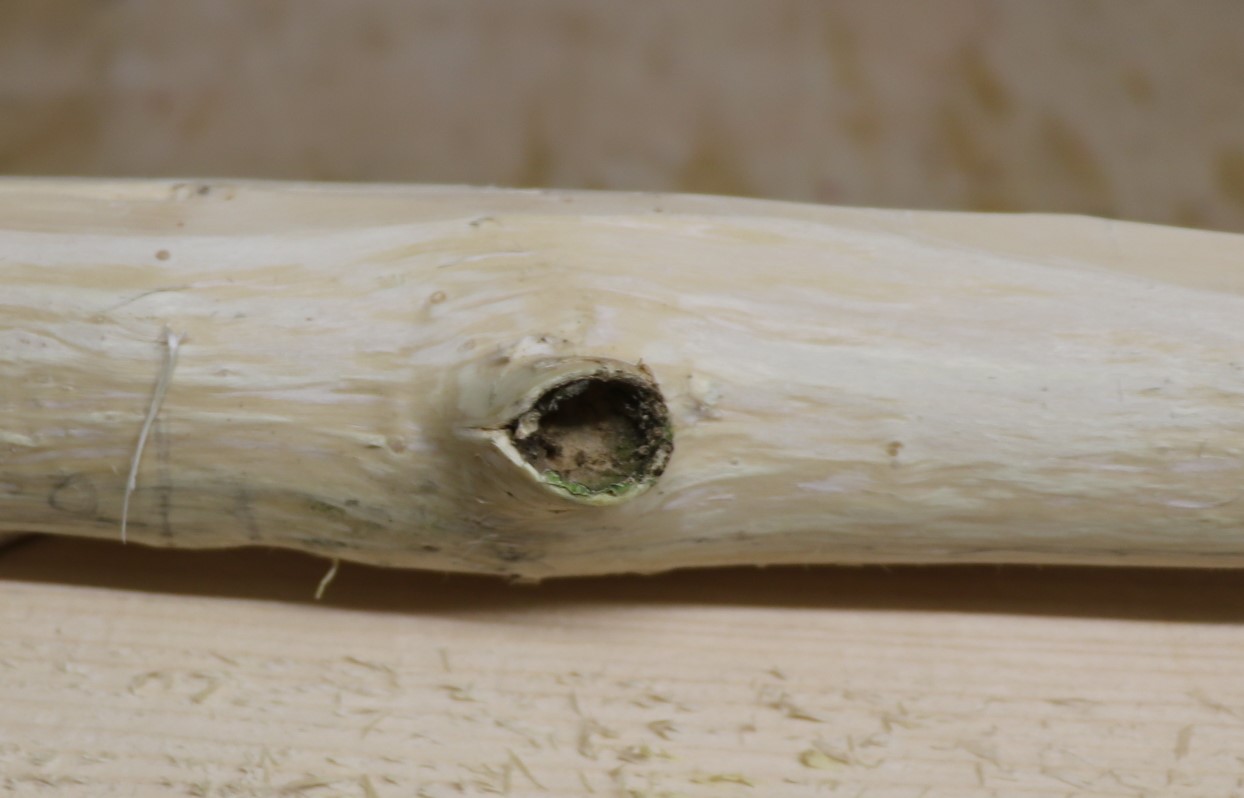 Das Stück Holz habe ich heute von dem Stab mit einer Japansäge abgesägt um daraus die Dübel zu schnitzen!