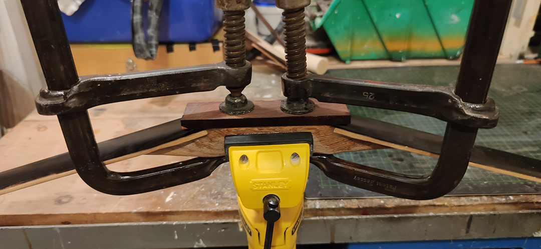 Dann habe ich ein kleines Brettchen Hartholz auf die Unterseite des Griffes geleimt.