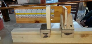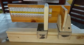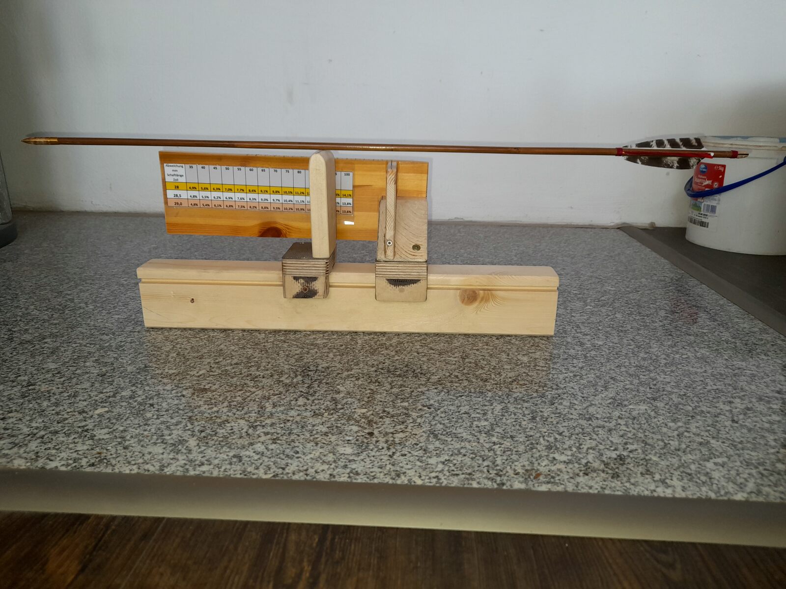 kurz zu den Bildern, der Vorrichtung, am rechten hochkant Holz ist eine Markierung für den geometrischen Mittelpunkt, die Pfeile